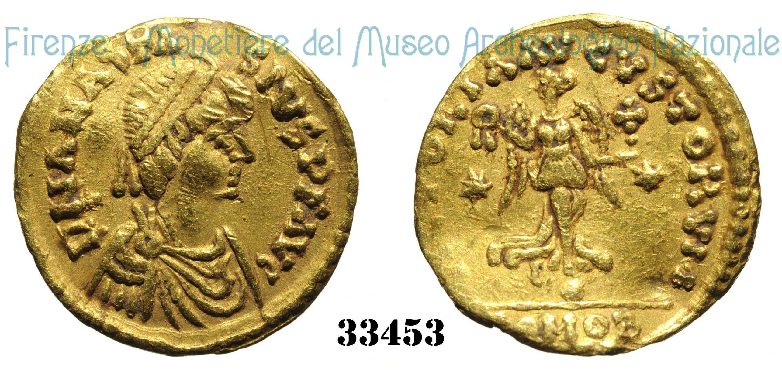 VICTORIAAVCVSTORVM Dritto: ↻ DNANASTA SIVSPFΛVC Busto diademato e drappeggiato di Anastasio a dx Verso: ↻ VICTORIAAVCVSTORVM Vittoria gradiente a dx con ghirlanda nella mano dx e croce nella sx, a dx stella a 8 punte, in ex. COMOB | |