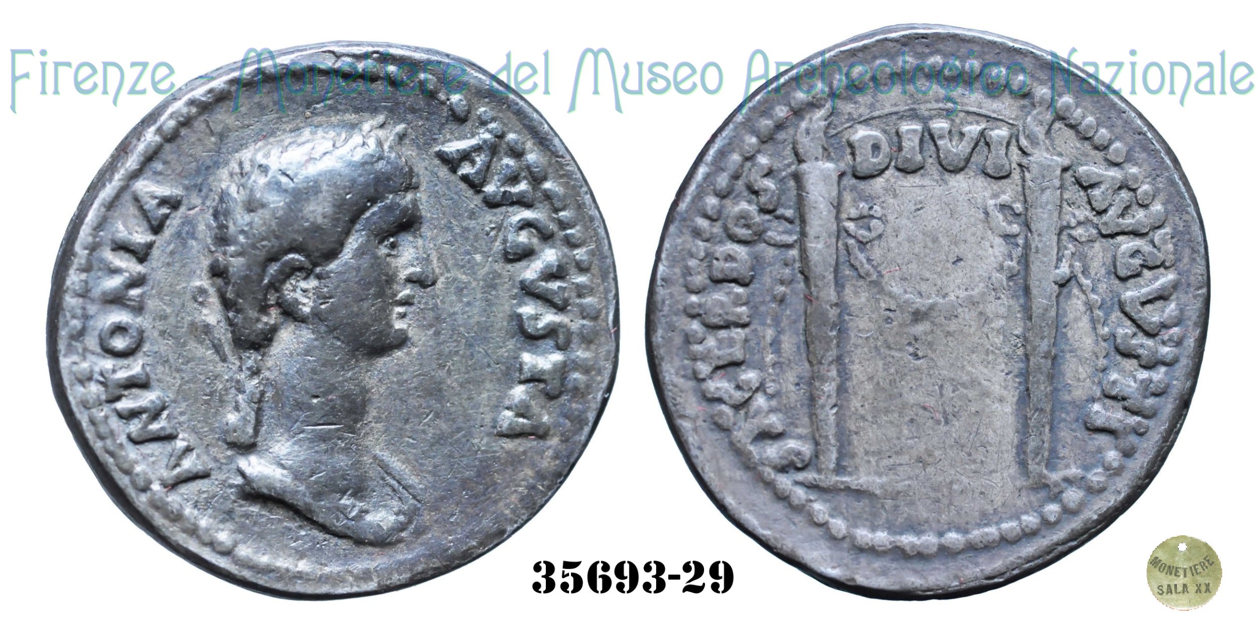 SACERDOS / DIVI/ AVGVSTI - Ric 68 Dritto: ↻ ANTONIA AVGVSTA Busto di Antonia a d. Verso: ↻ SACERDOS / DIVI/ AVGVSTI Due lunghe torce verticali accese e legate da un nastro |