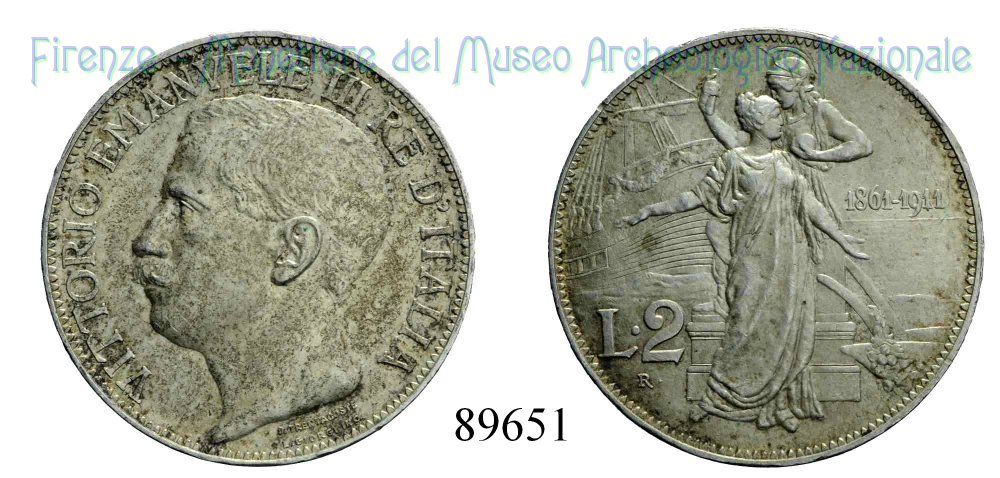 2 Lire "Cinquantenario" Dritto: ↻ VITTORIO EMANVELE III RE D’ITALIA Testa nuda a sinistra; sotto, su due righe, D • TRENTACOSTE/L • GIORGI • INC. Verso: Allegoria rappresentante l’Italia e Roma; sullo sfondo, nave mercantile; l’Italia poggia la sinistra su aratro ornato di frutti e di spighe, sormontato dalle date 1861-1911; a s, il valore e, sotto, l’iniziale di zecca, R. | |