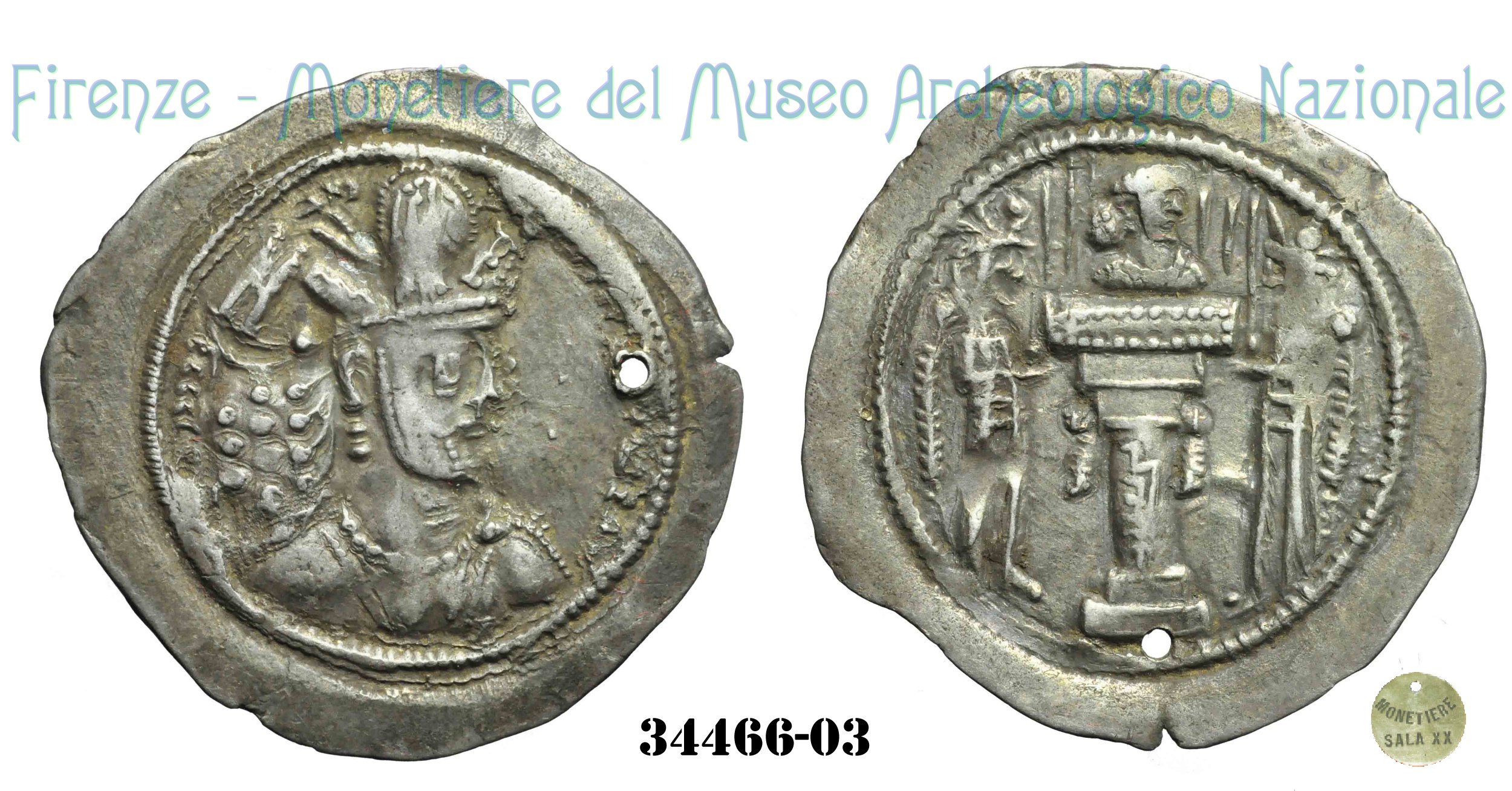 Emidracma Dritto: legenda pahlavi: mazdisn bagi Sahpuhri malkan malka airan - l ’adoratore di Hormazd, il divino Sapor, re dei re dell’Iran Busto frontale decorato del re con la testa barbuta verso destra, indossa orecchini e una corona merlata con paraorecchie e sormontata da globo o korymbos, cravatte e diadema a seguire un contorno di capelli dietro; in un contorno puntinato. Verso: legenda pahlavi: nura zi Sahpuhri - il fuoco di Sapor Altare del fuoco nel campo centrale, finemente decorato su due scalini, con nastri ai lati della colonna su cui si legge: Rasti (giustizia). Mezzo busto del re tra le fiamme verso destra con due inservienti vestiti d’abito regale e con copricapi, stanti ai lati e rivolti verso l’interno, tengono la spada verticale in alto con entrambe le mani; il tutto in un contorno puntinato |