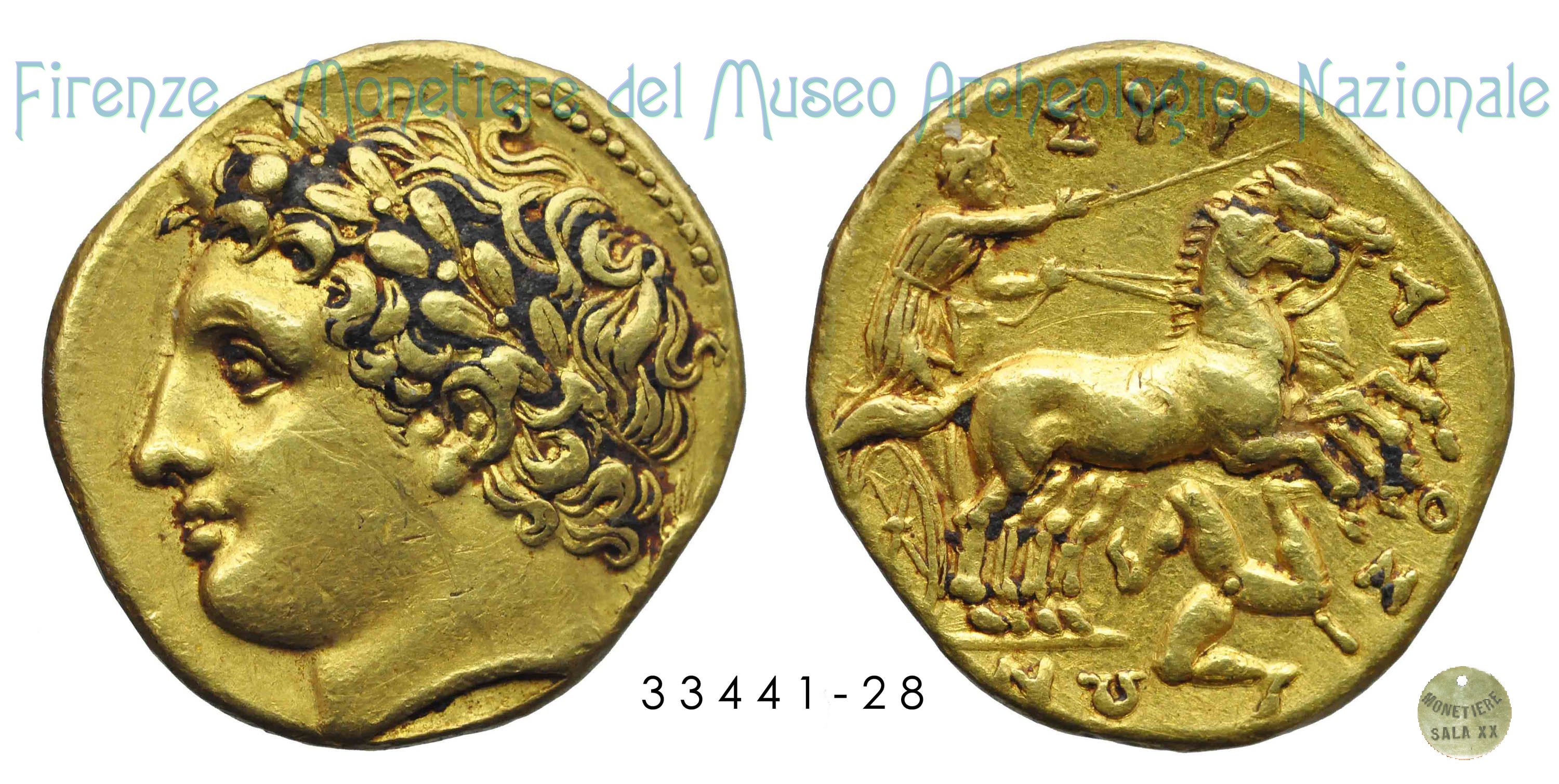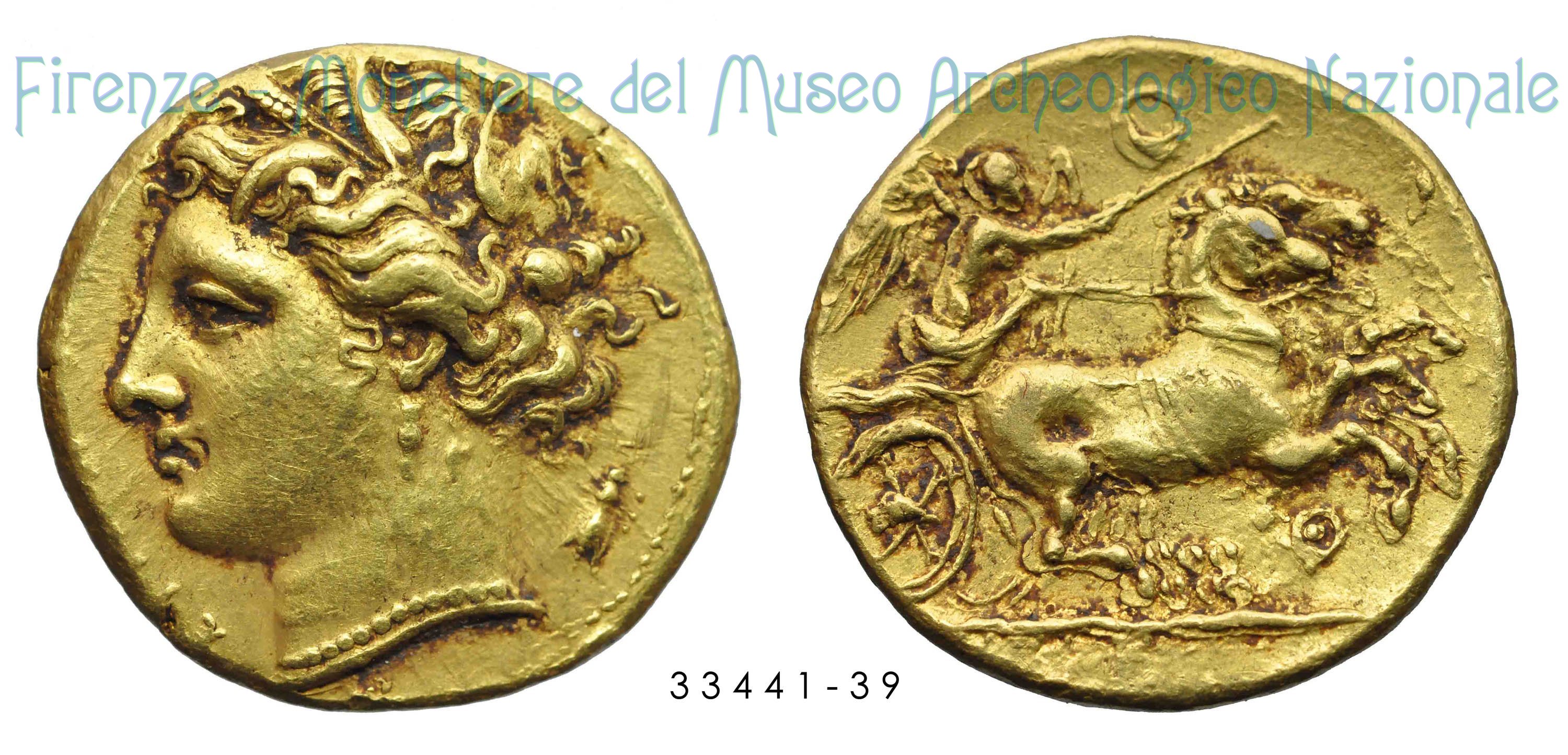 Testa di Apollo a sinistra_Biga al galoppo a destra(Agatocle) Dritto: D/ Testa laureata di Apollo a sinistra, dietro spiga di grano; Verso: ↻ ΣΥΡΑΚΟΣΙΩΝ R/ Biga in corsa verso destra guidata da auriga; sotto, triscele; intorno, ΣΥΡ-ΑΚ-ΟΣΙ-ΩΝ; | |