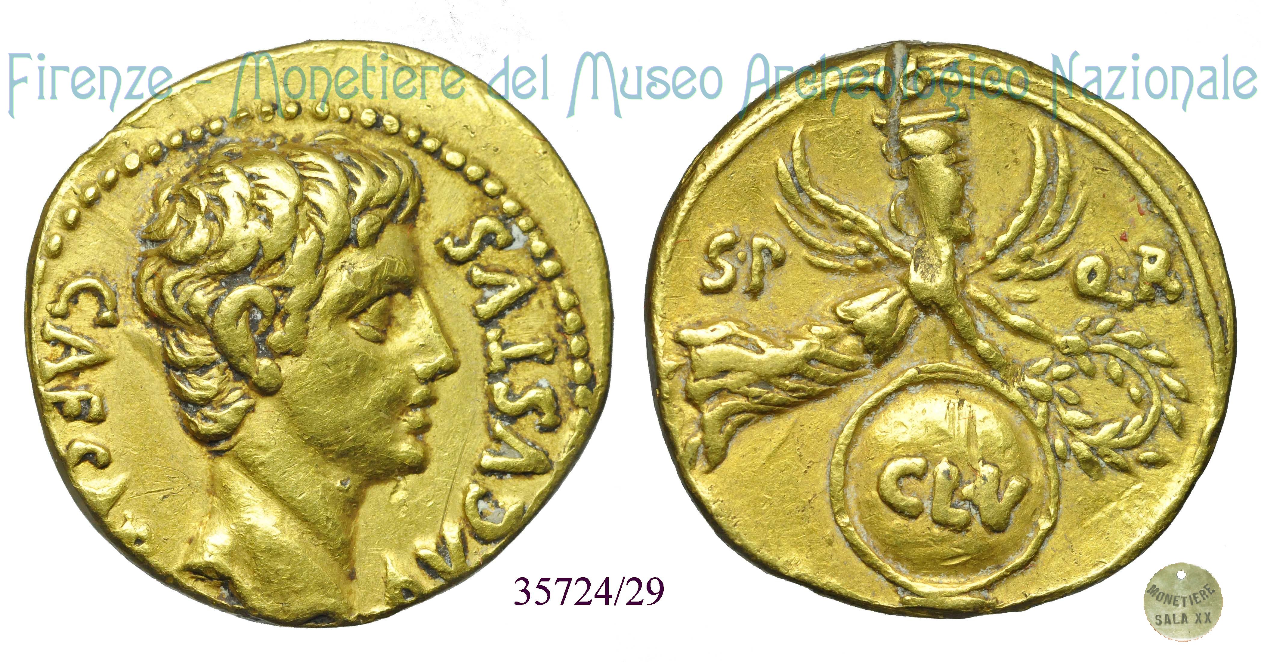 SP-QR / RIC 61 Dritto: CAESAR- AVGVSTVS Testa nuda di Augusto a d. Verso: SP-QR Vittoria, in volo verso destra, con corona nelle mani; sotto, scudo iscritto CL.V | |