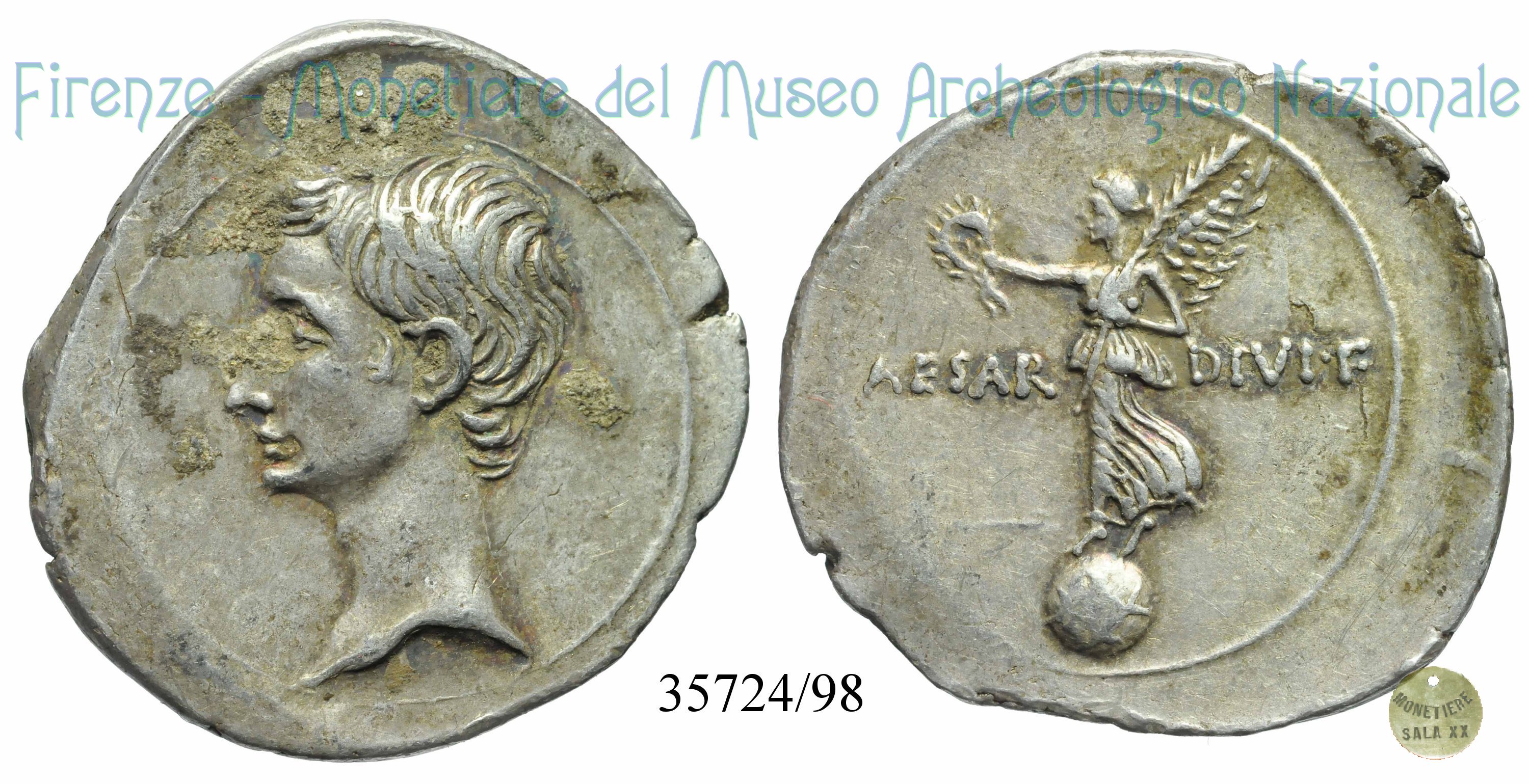CAESAR- DIVI F / RIC 254b (come Ottaviano) Dritto: Testa nuda di Ottaviano a sinistra Verso: → CAESAR- DIVI F Vittoria stante volta a sinistra su globo con corona nella destra e ramo di palma sulla spalla sinistra | |