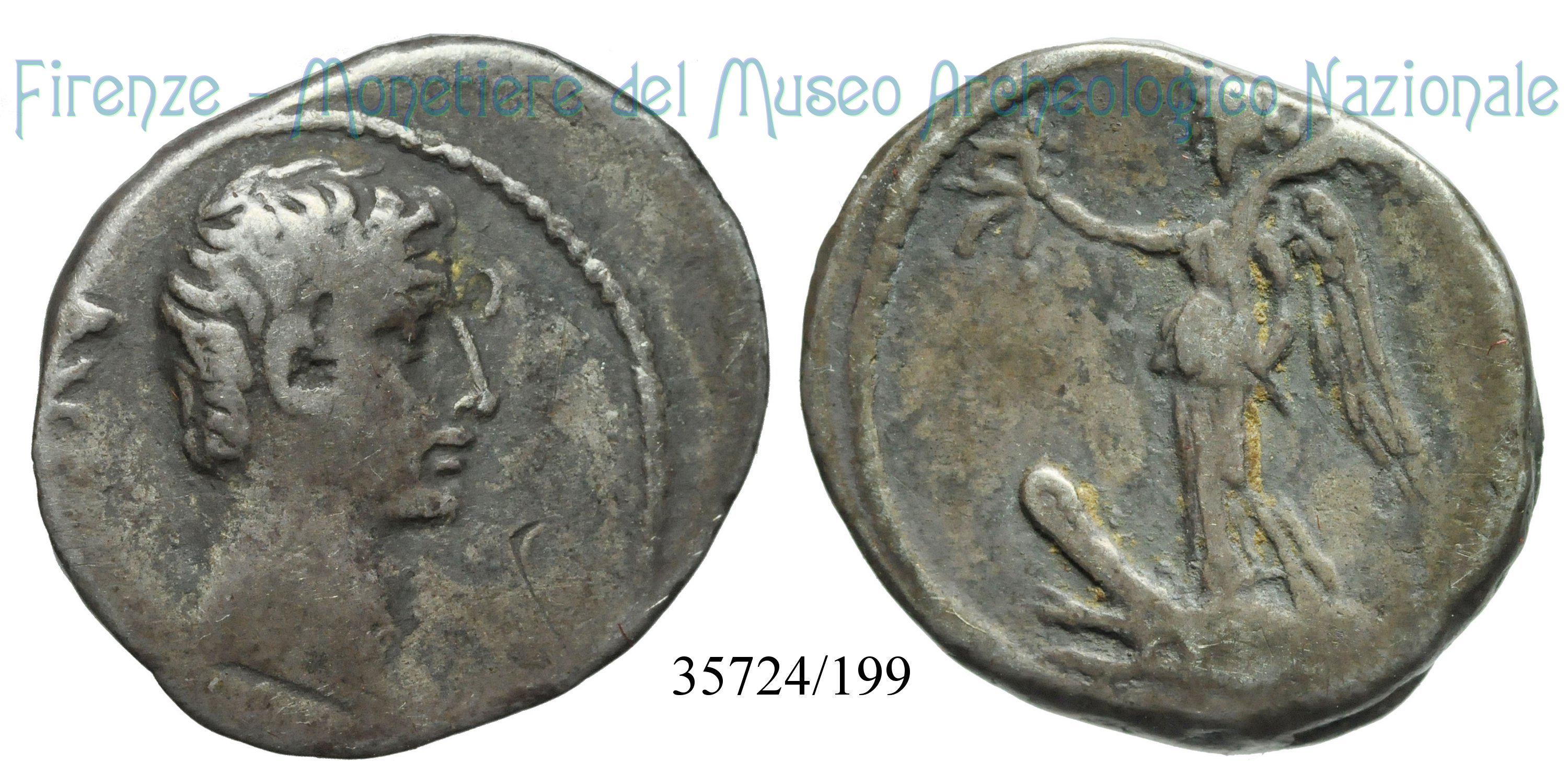 IMP- CAESAR / RIC 268 (come Ottaviano) Dritto: Testa nuda di Ottaviano a d. Verso: → IMP- CAESAR Vittoria stante di fronte su globo, la testa volta a sinistra ed ali aperte, con corona nella destra e vessillo sulla spalla sinistra | |