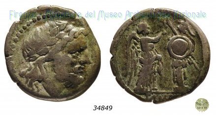 Testa di Giove / Vittoria e trofeo (RRC 105/1) Dritto: Testa di Giove laureata a destra Bordo di punti. Verso: → ROMA Vittoria stante a destra, che incorona un trofeo; al centro, pentagono; in esergo, ROMA. Bordo lineare. |