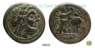 Testa di Giove / Vittoria e trofeo (RRC 95/1a) Dritto: Testa di Giove laureata a destra Bordo di punti. Verso: → VB / ROMA Vittoria stante a destra, che incorona un trofeo; al centro, VB ; in esergo, ROMA. Bordo lineare. | |
