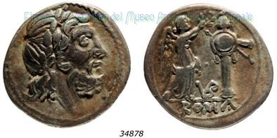 Testa di Giove / Vittoria e trofeo (RRC 97/1a) Dritto: Testa di Giove laureata a destra Bordo di punti. Verso: → L / ROMA Vittoria stante a destra, che incorona un trofeo; al centro, L; in esergo, ROMA. Bordo lineare. | |