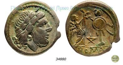 Testa di Giove / Vittoria e trofeo (RRC 93/1a) Dritto: Testa di Giove laureata a destra Bordo di punti. Verso: → MP / ROMA Vittoria stante a destra, che incorona un trofeo; al centro, MP ; in esergo, ROMA. Bordo lineare. | |
