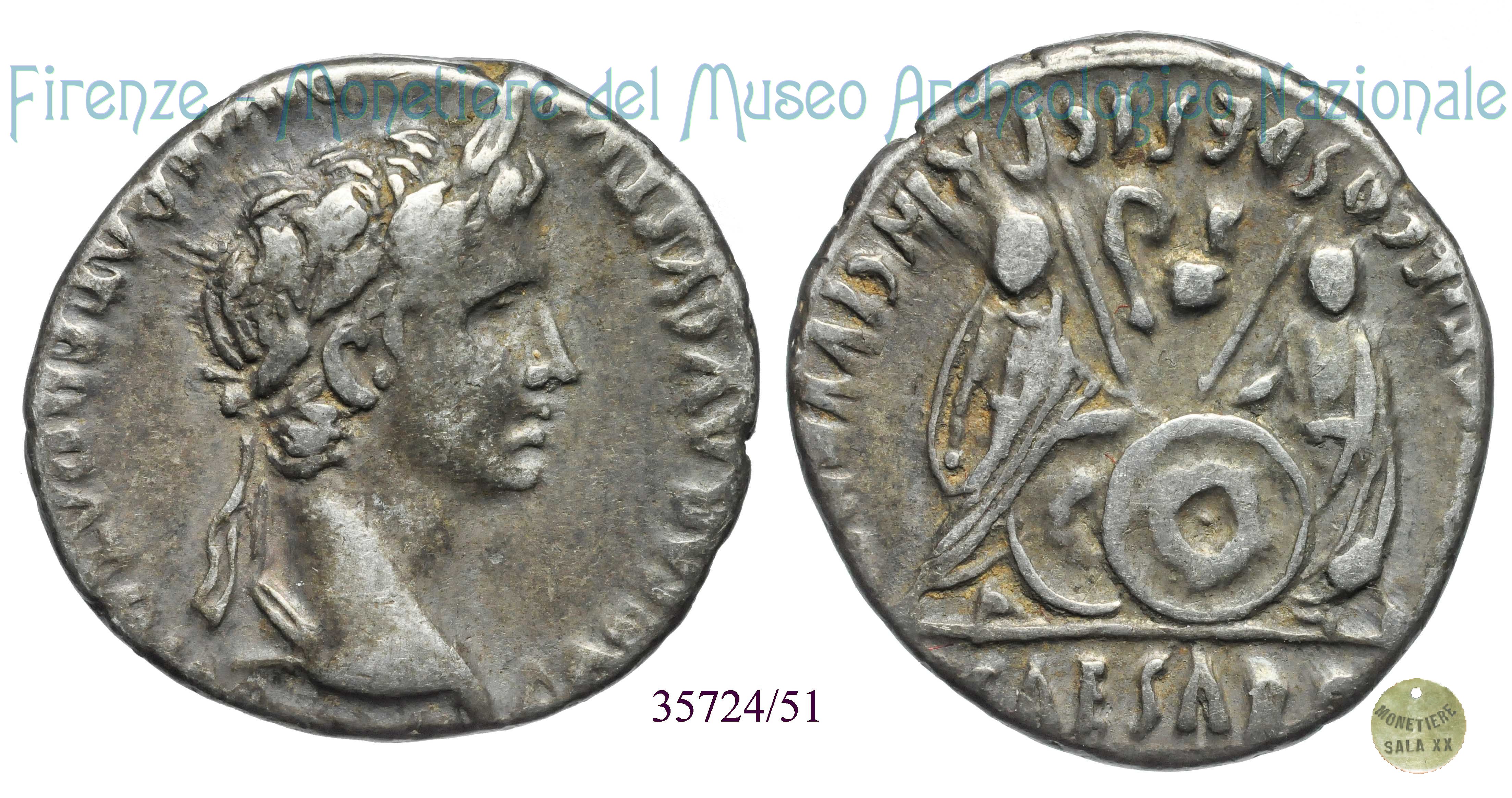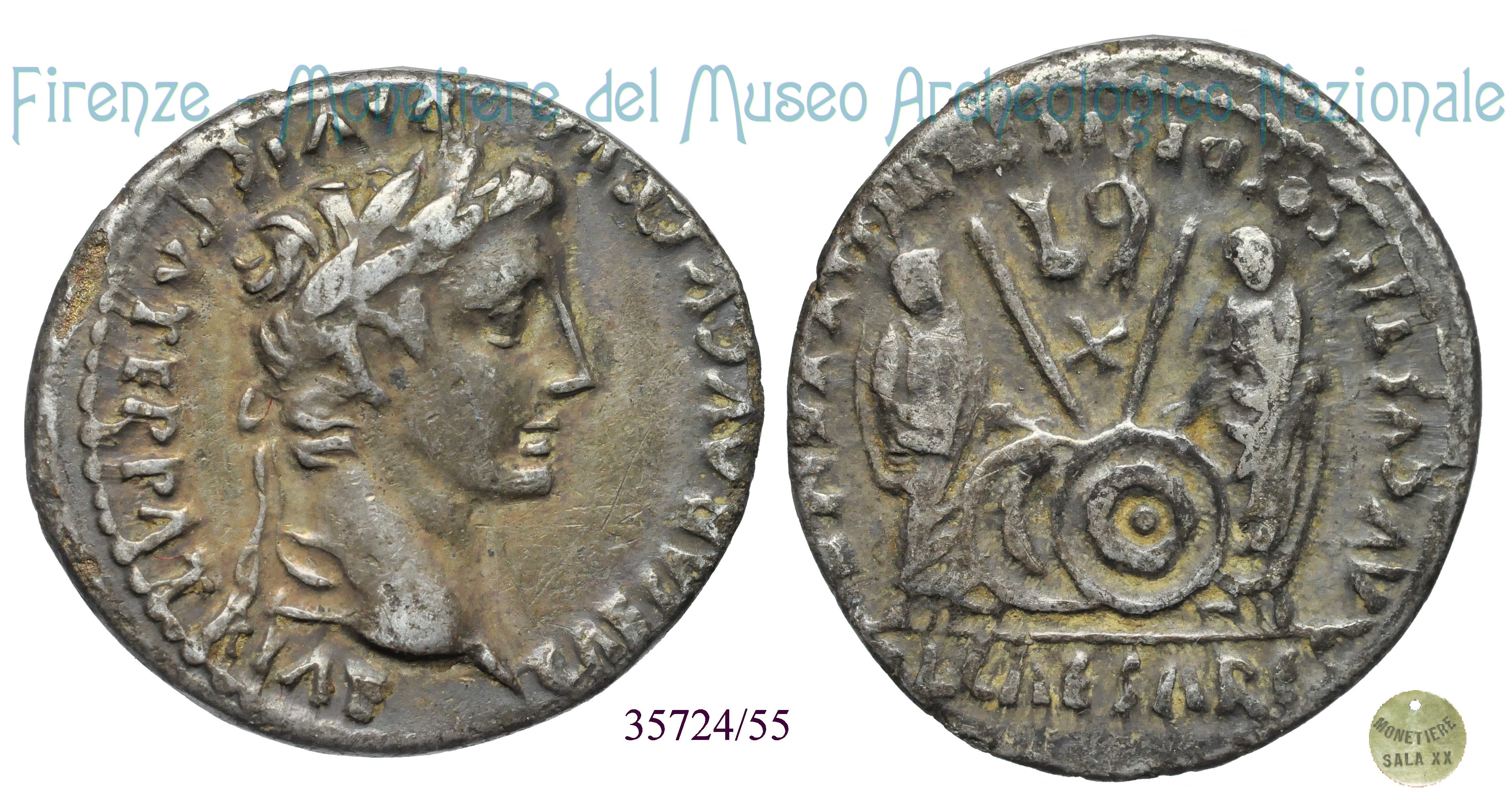C L CAESARES AVGVSTI F COS DESIG PRINC IVVENT / RIC 207 Dritto: ↺ CAESAR AVGVSTVS DIVI F PATER PATRIAE Testa laureata di Augusto a d. Verso: ↺ C L CAESARES AVGVSTI F COS DESIG PRINC IVVENT Gaio e Lucio Cesari stanti di fronte con scudo e asta; sopra, al centro, simpulum e lituus |