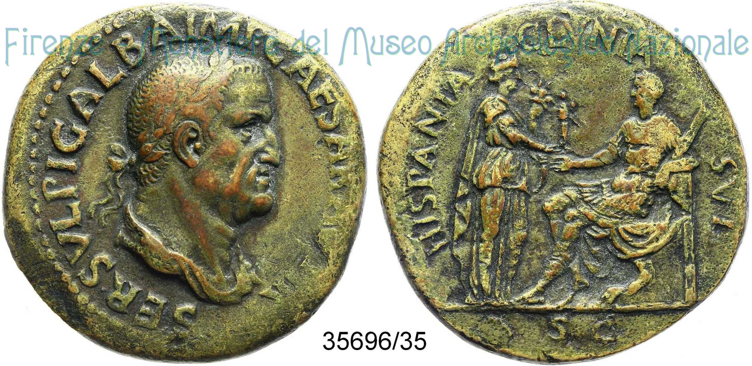 HISPANIA — CLVNIA — SVL | Ric 470 Dritto: ↻ SER SVLPI GALBA IMP CAESAR AVG TR P Busto laureato e paludato a d. Verso: ↻ HISPANIA — CLVNIA — SVL, S C (ex.) Galba, a capo scoperto e in abiti militari, é seduto su sedia curule verso sinistra e regge un parazonium con la mano sinistra, mentre tende la mano destra verso una figura femminile in piedi di fronte a lui. Questa gli porge un palladium che regge con la mano destra, mentre con la mano sinistra regge una cornucopia. In esergo sigla SC | |