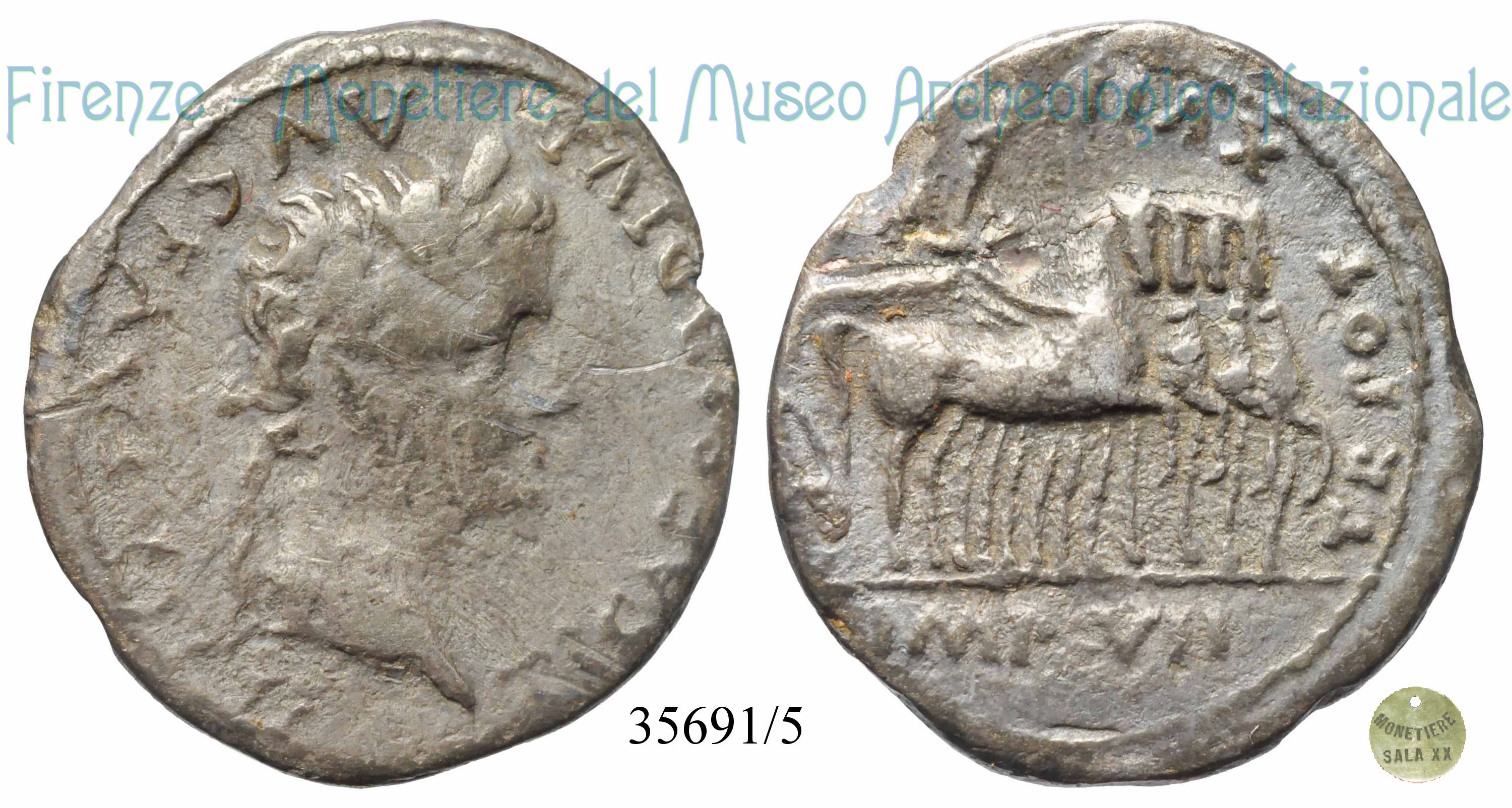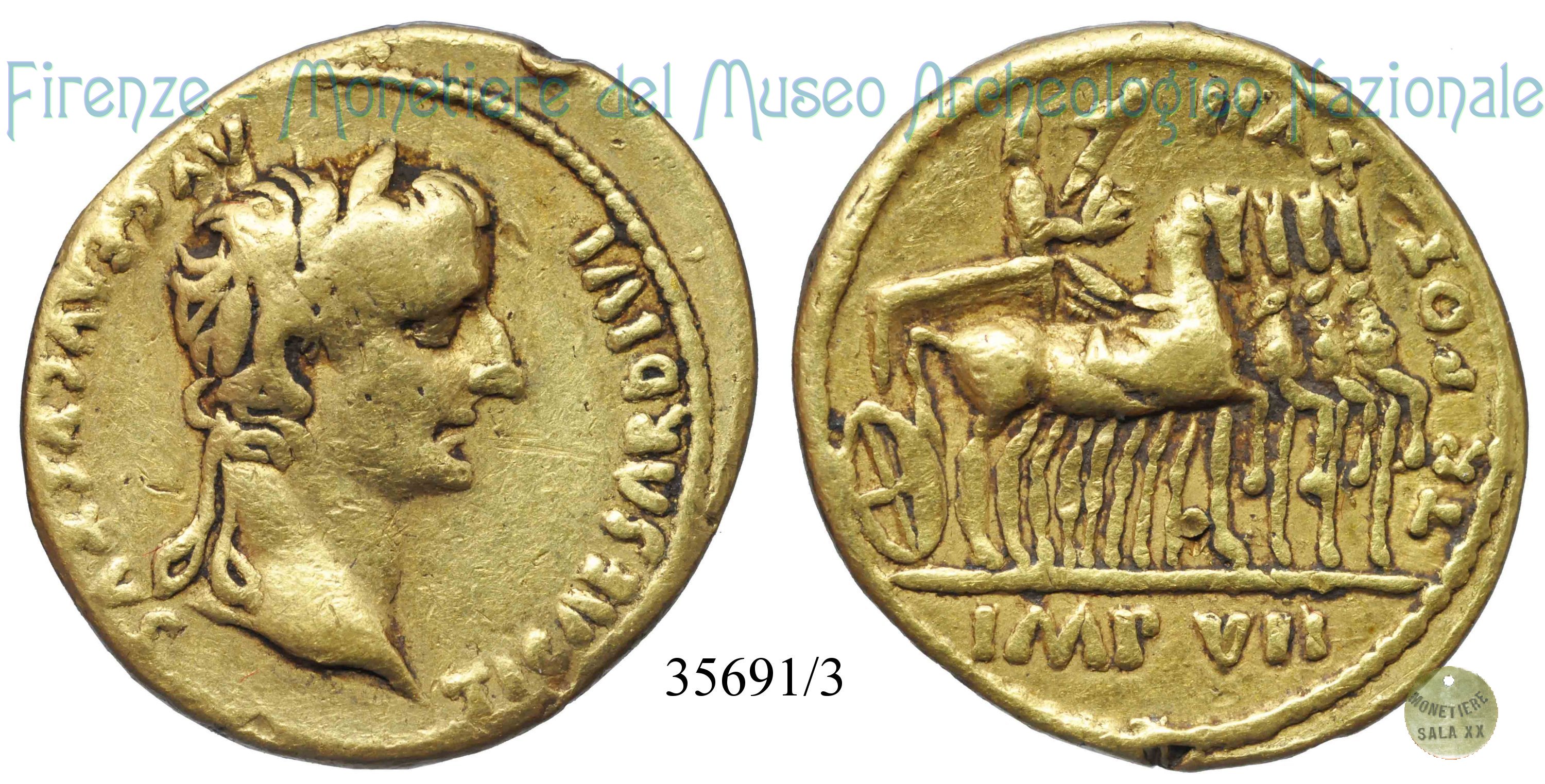 TR POT XVII IMP VII / RIC 3 Dritto: ↺ TI CAESAR DIVI AVG F AVGVSTVS Testa laureata a d. Verso: ↺ TR POT XVII IMP VII L’imperatore con ramo d’alloro e scettro su quadriga lenta a d. | |