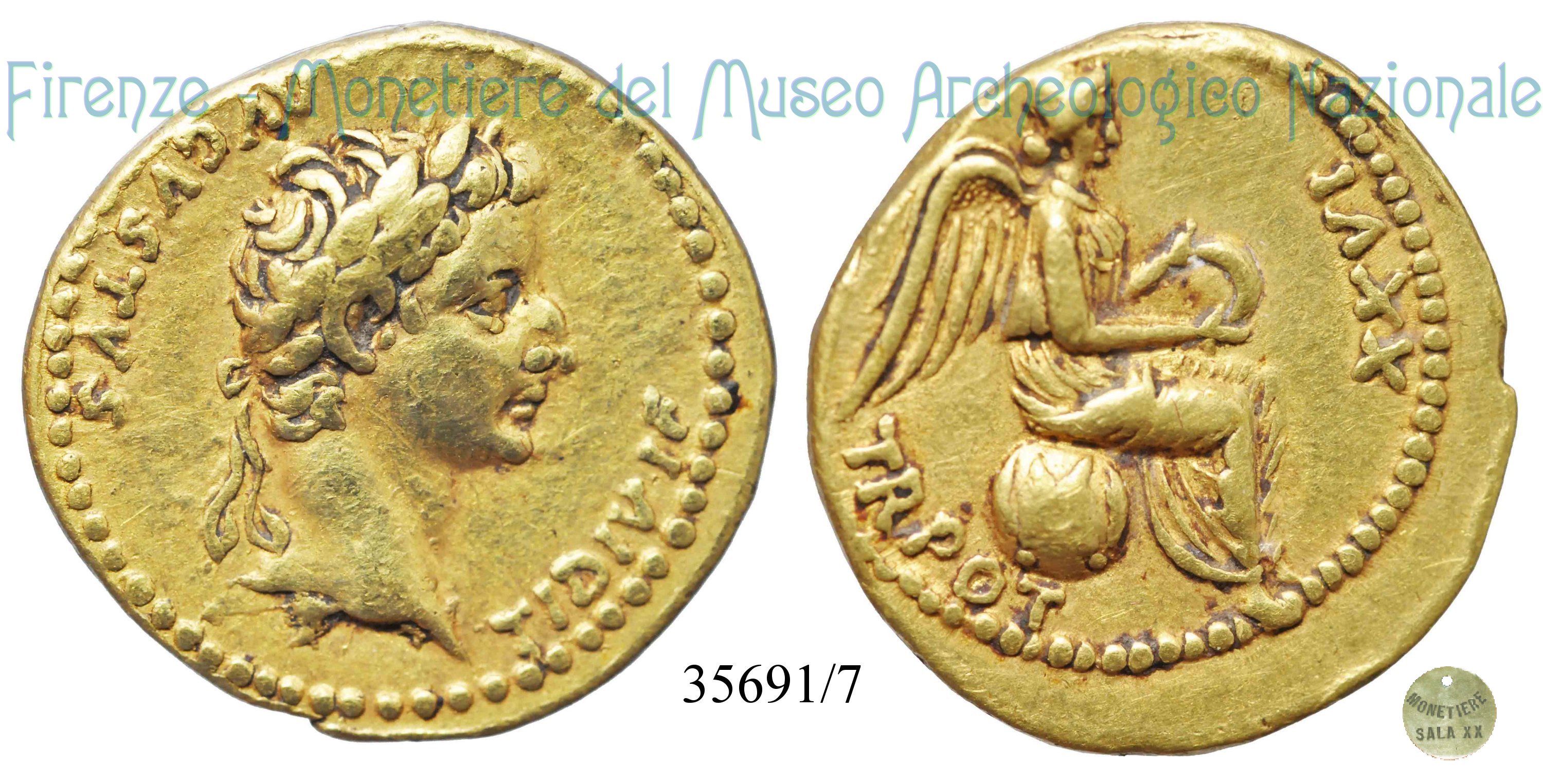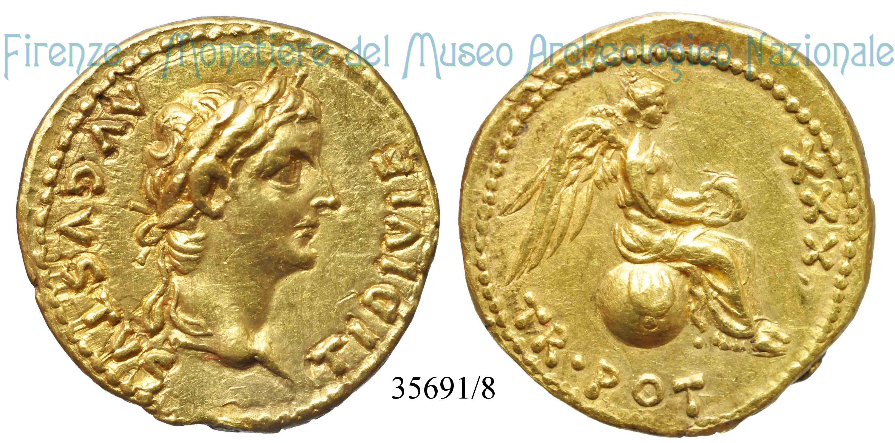 TR POT XXX - RIC 14 Dritto: ↺ TI DIVI F AVGVSTVS Testa laureata a d. Verso: ↺ TR POT XXX Victoria seduta su globo a destra con corona | |