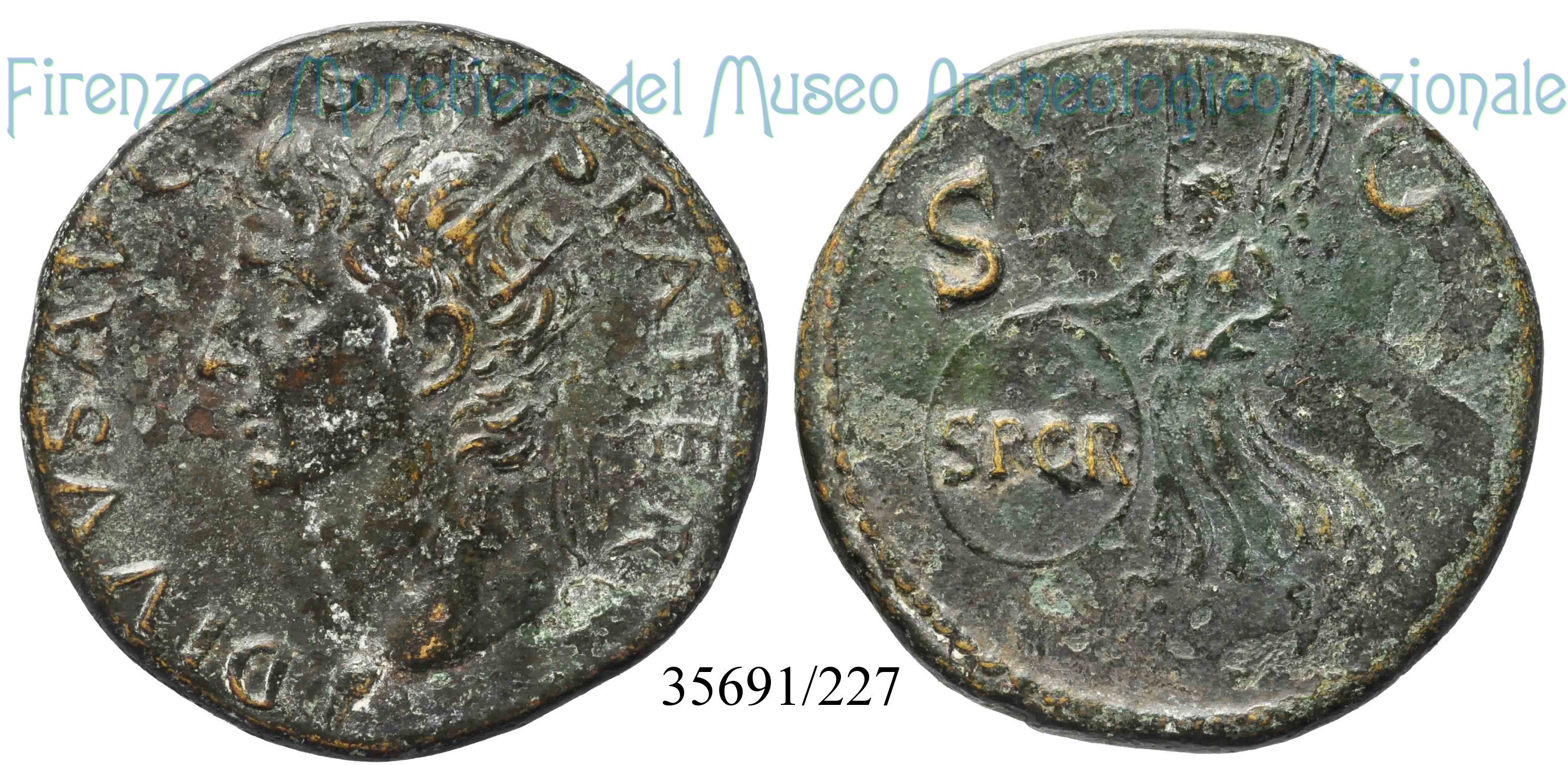 DIVVS AVGVSTVS PATER - RIC 77 Dritto: ↻ DIVVS AVGVSTVS PATER Testa radiata di Augustus a sinistra Verso: → SPQR S C Victoria avanzante a s, con scudo |
