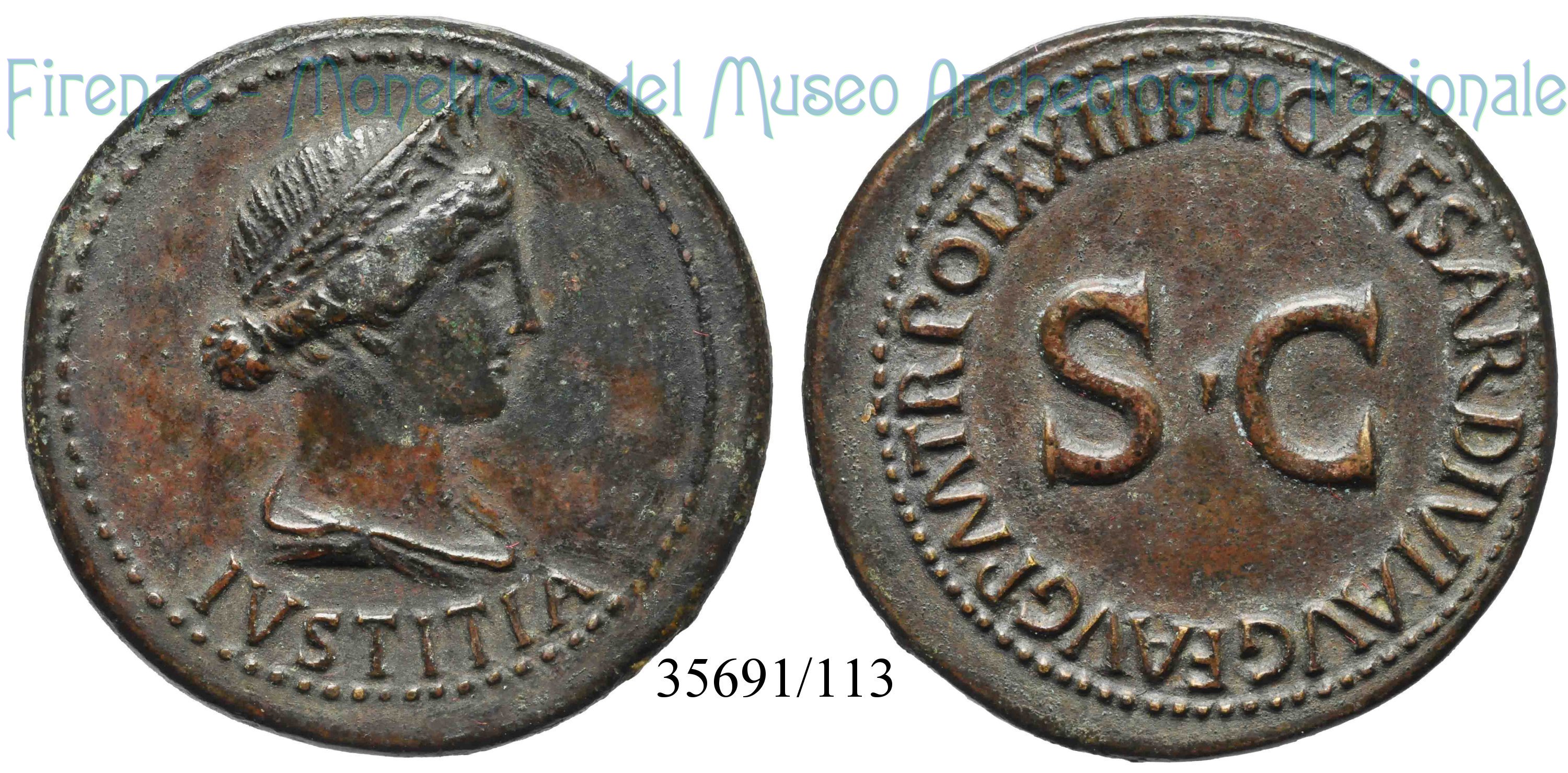 TI CAESAR DIVI AVG F AVG TR POT XXIIII SC Dritto: ↺ IVSTITIA Busto drappeggiato diademato di Iustitia a d. Verso: ↻ TI CAESAR DIVI AVG F AVG TR POT XXIIII SC grande S C |