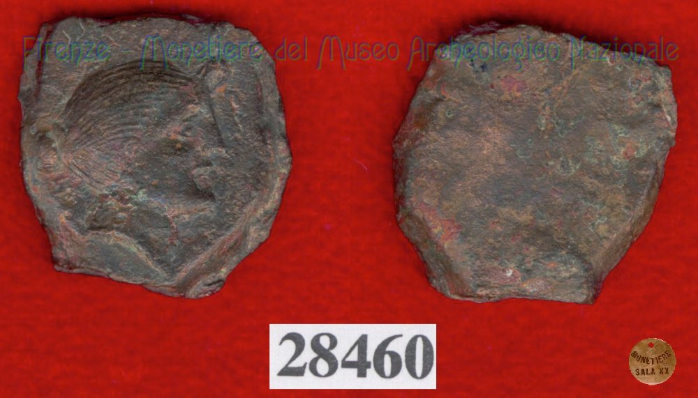 Testa femminile / liscio (HN Italy 198) Dritto: ↓ vatl Testa femminile a destra, i capelli raccolti dietro la nuca e legati con un nastro; dietro, dall’alto, vatl Verso: liscio | |