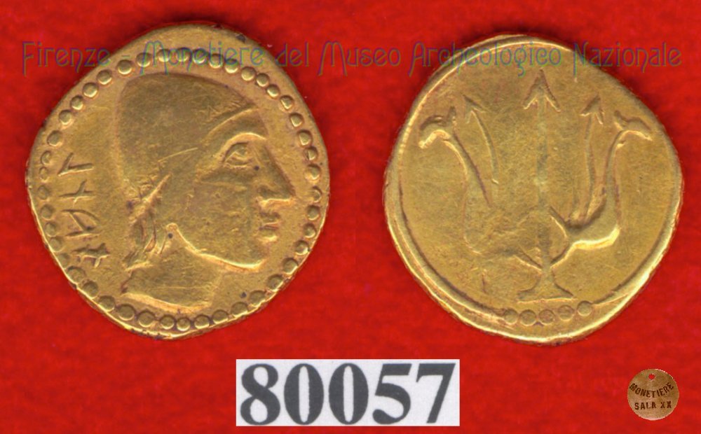 Testa giovanile / tridente (HN Italy 203) Dritto: ← vatl Testa giovanile a destra, coperta con spoglie di mostro marino; dietro due globetti; sotto, retrograda, vatl Verso: Tridente accostato da due delfini; ai lati due globetti | |