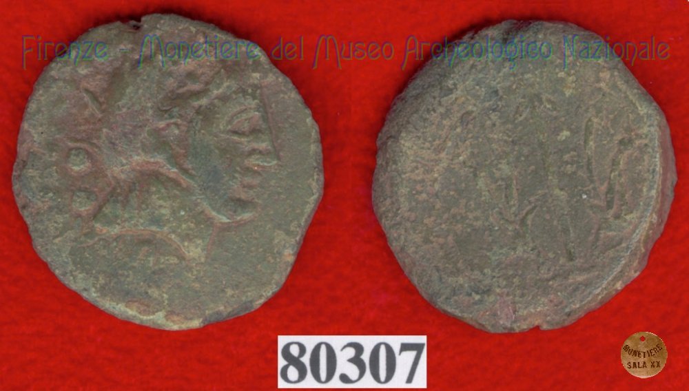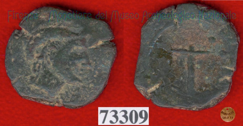 Testa giovanile / ancora (HN Italy 202) Dritto: Testa giovanile a destra coperta con spoglia di delfino; sopra tre globetti. Verso: Ancora; a destra tracce di leggenda; a sinistra, tre globetti. | |