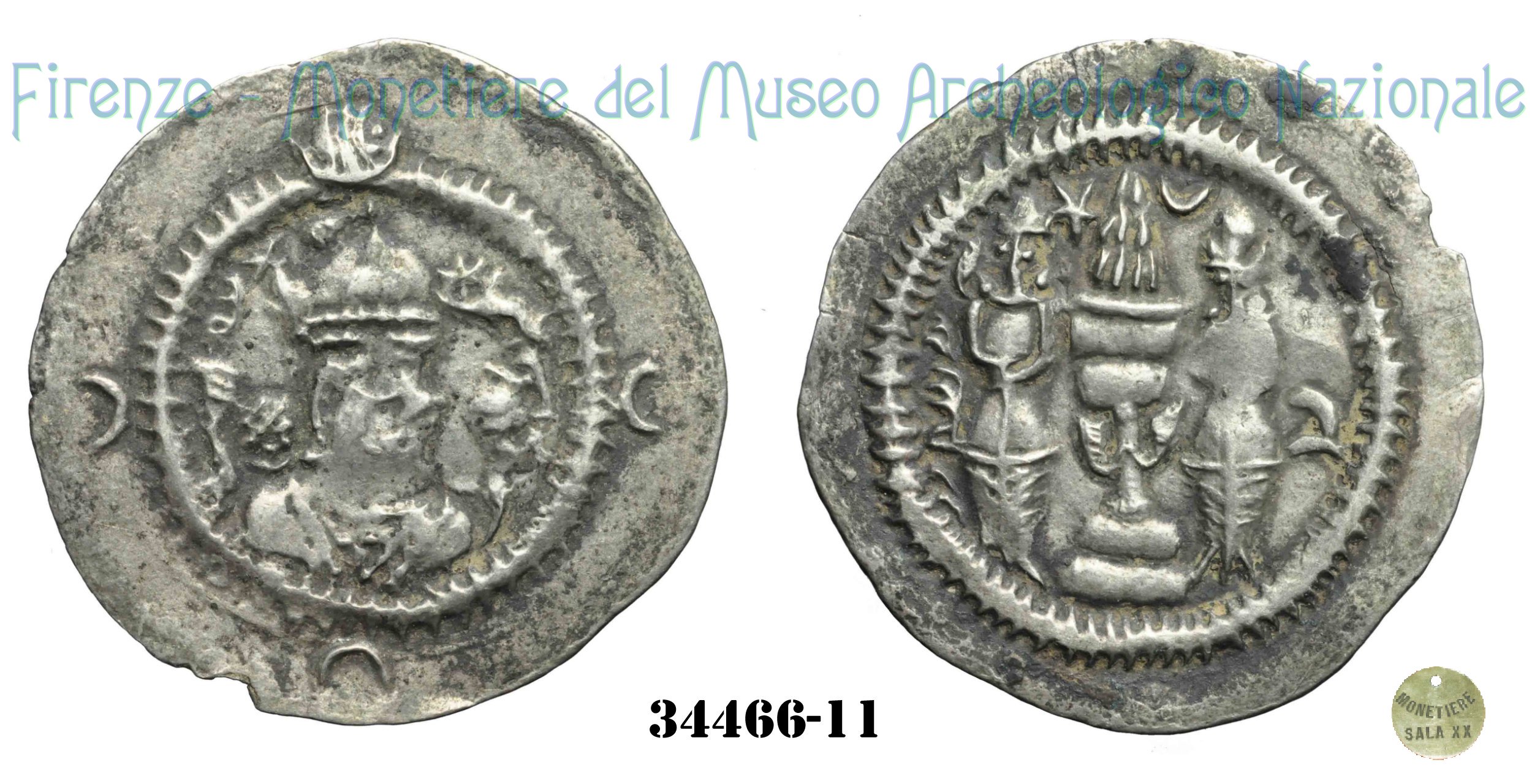 Dracma (592-593 d.C. - Hamadhan) D/ Legenda Pahlavi: (a destra): afzut Husrui Che Chosroe sia prospero; (a sinistra): Harman la potenza (la fortuna) R/ Legenda Pahlavi: Talata (anno 3) e AH Göbl SN, Xusro II, IIb / 3 (Plate XIII/211-215);