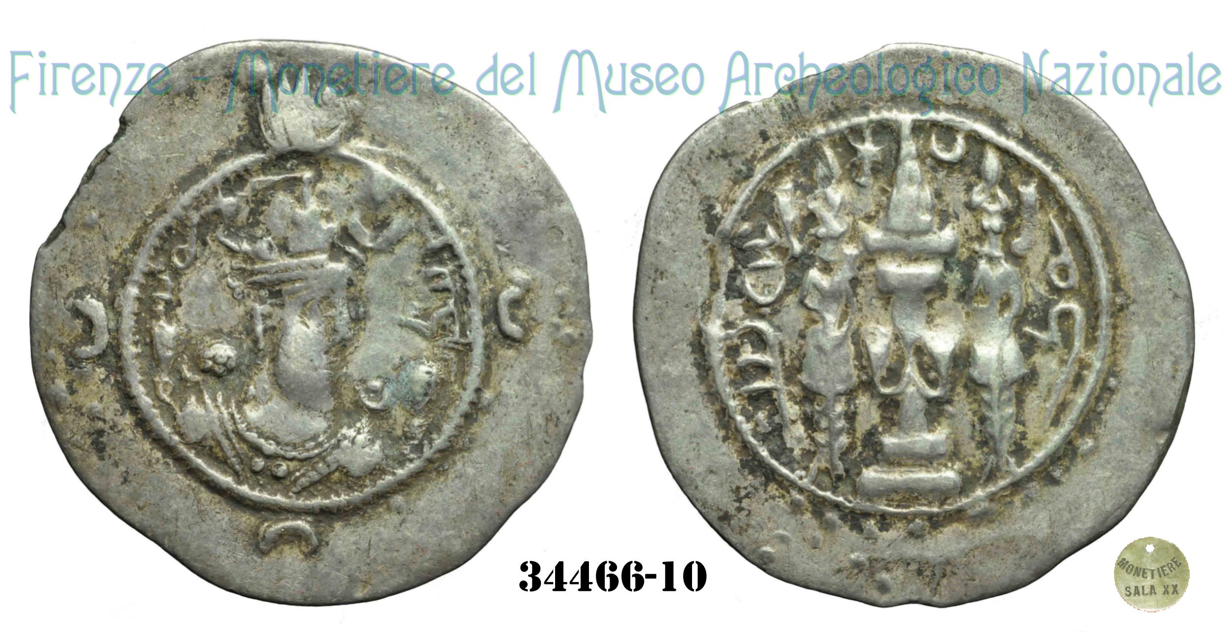 Dracma (598-599 d.C. - Hamadhan) D/ Legenda Pahlavi: (a destra): afzut Husrui Che Chosroe sia prospero; (a sinistra): Harman la potenza (la fortuna) R/ Anno e zecca: Tisha (anno 9) e AH | Monetiere Archeologico Firenze | Sat 5/07/14 - 22:43 | ||