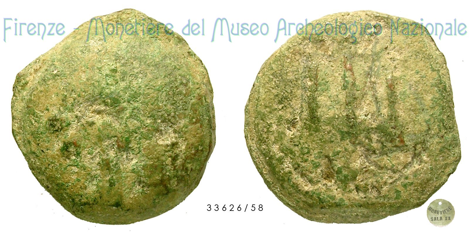 Serie Triskeles - Tridente (300-275 a.C. - Incerta Centro Italia) D/ Triskeles R/ Tridente Vecchi 300; Gamurrini Per. Num. IV, 1 ss.; Garrucci tav. LIV, 1 (B) Entrambe le facce | Monetiere Archeologico Firenze | Fri 3/01/14 - 00:30 | ||