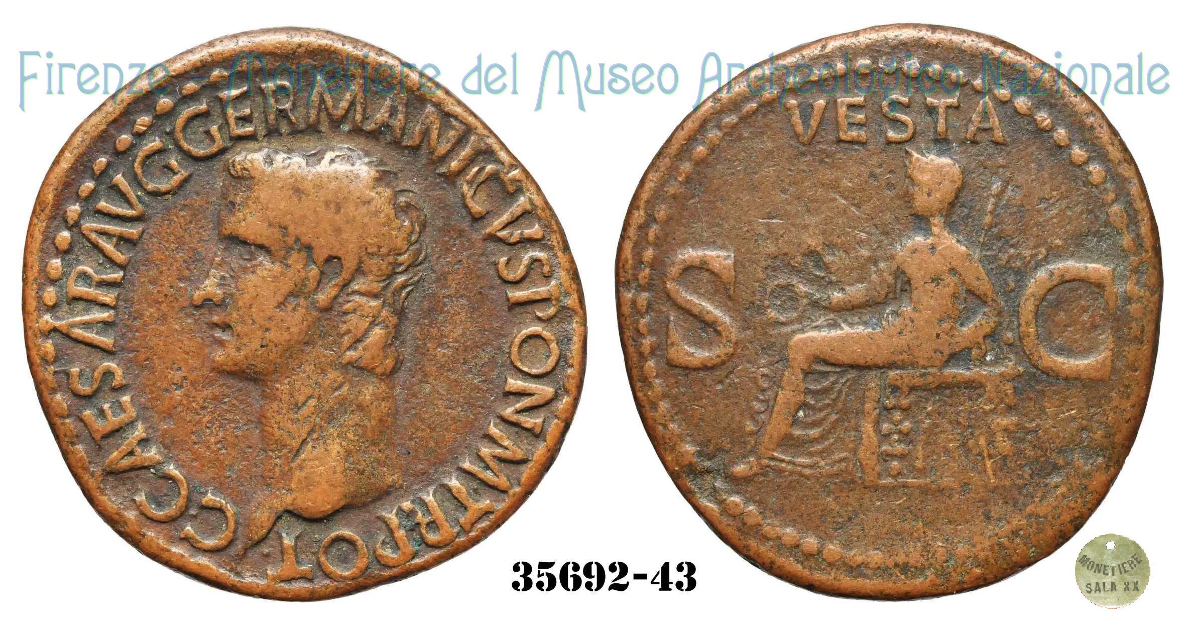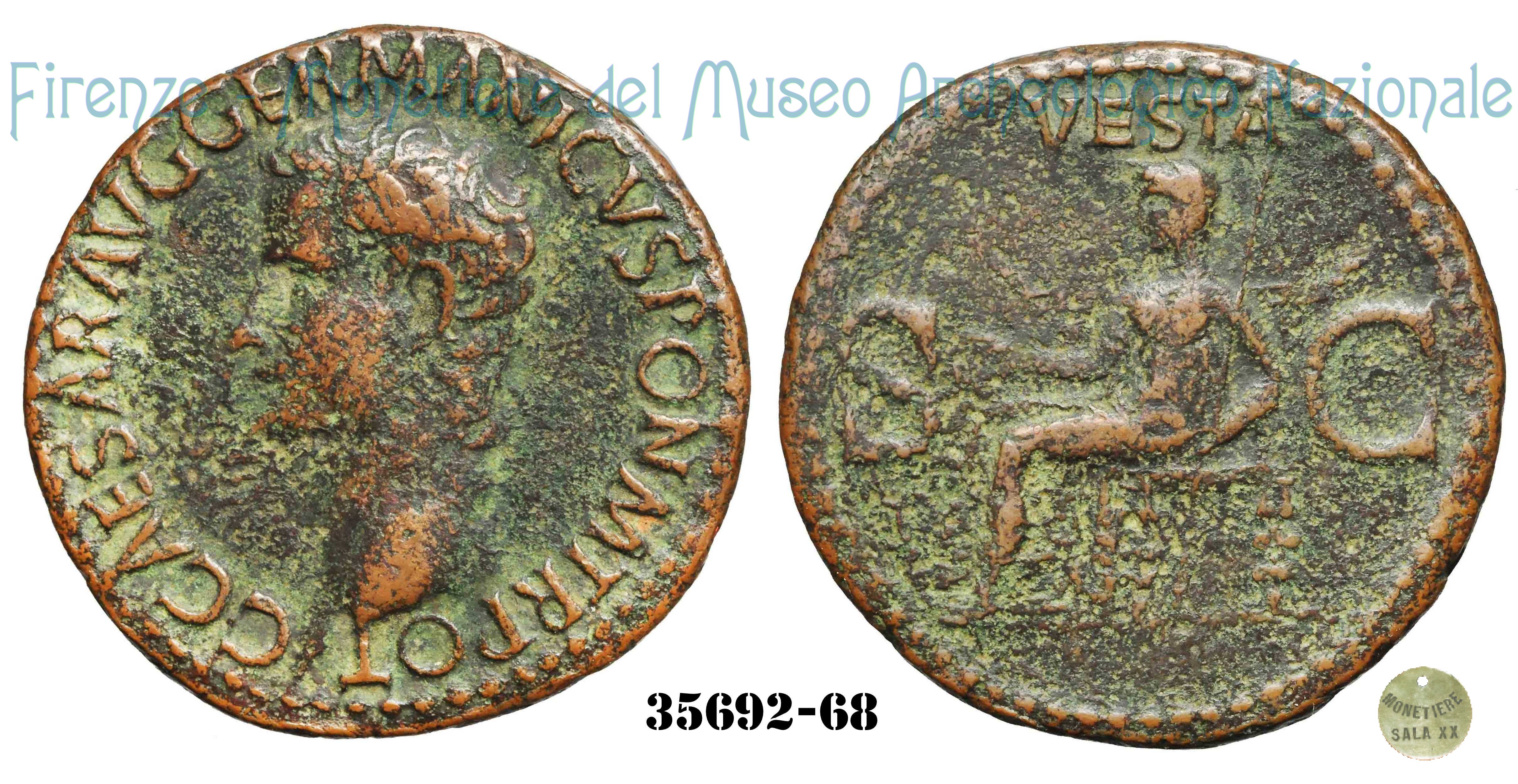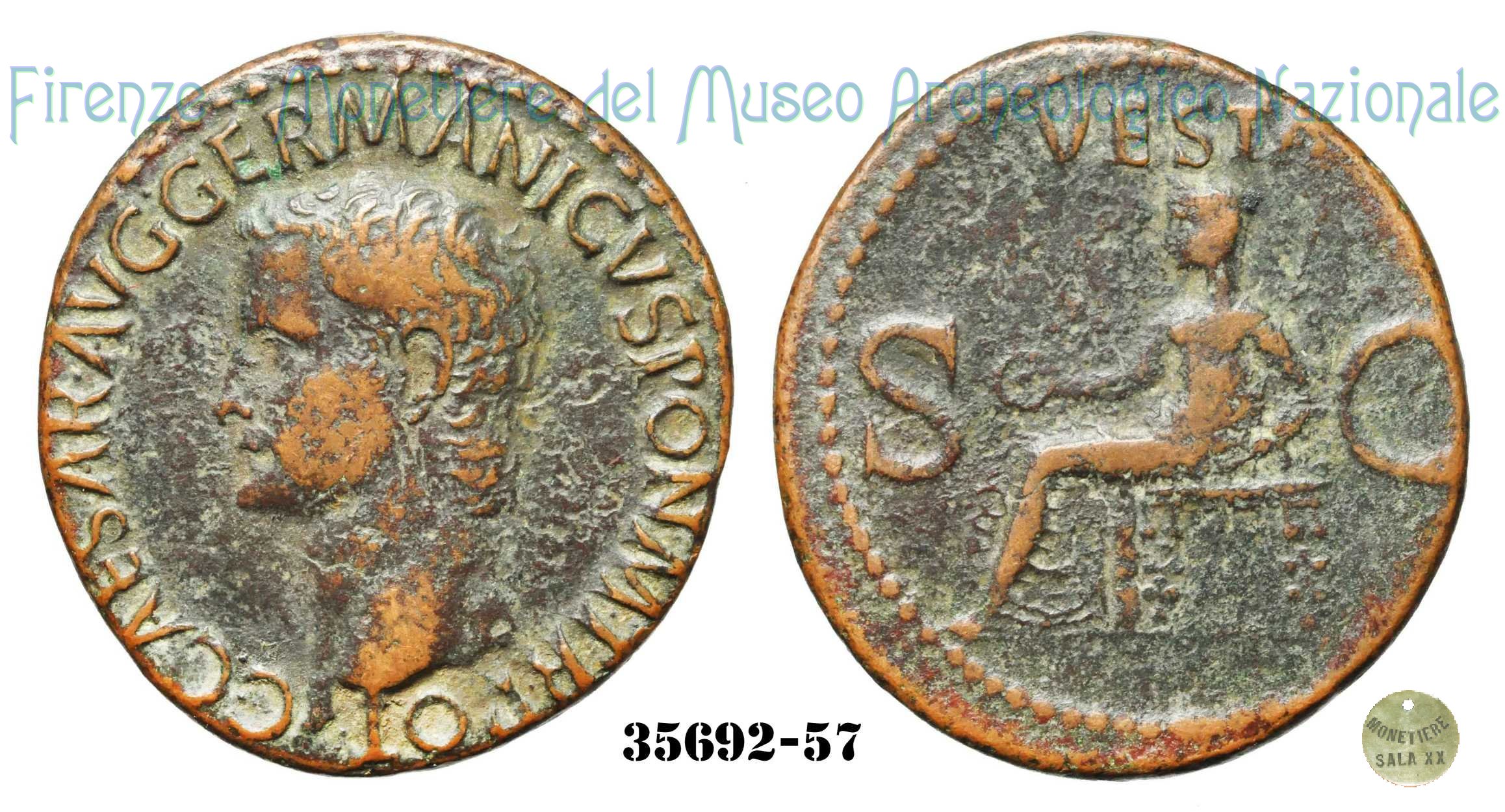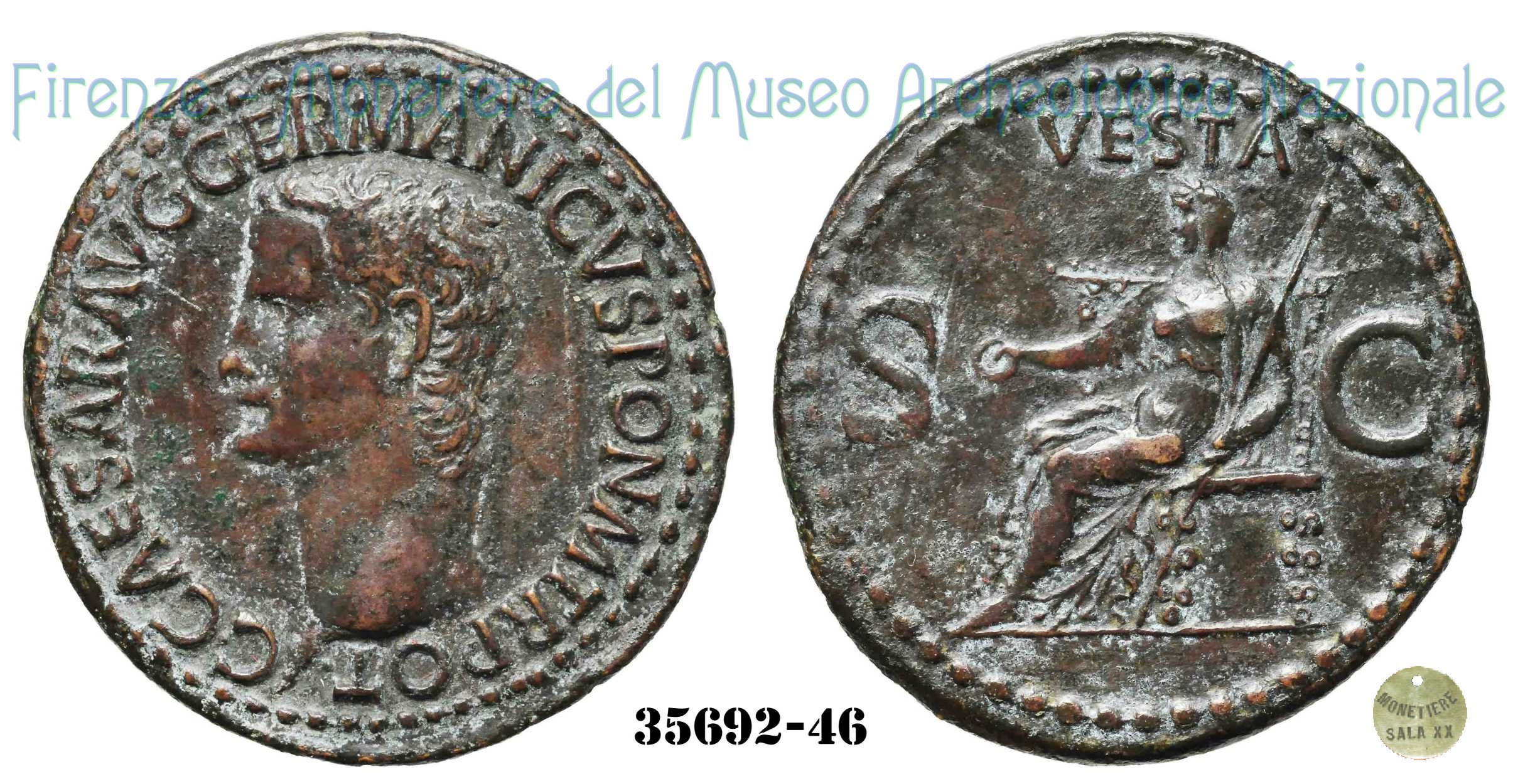 VESTA (S.C.) - Ric. 38 (37-38 d.C. - Roma) D/ C CAESAR AVG GERMANICVS PON M TR POT R/ VESTA (in alto) S - C a sinistra e destra Ric. 38 (Vol.1); BMC 46; GiuCla 465. | Monetiere Archeologico Firenze | Fri 26/07/13 - 10:09 | ||