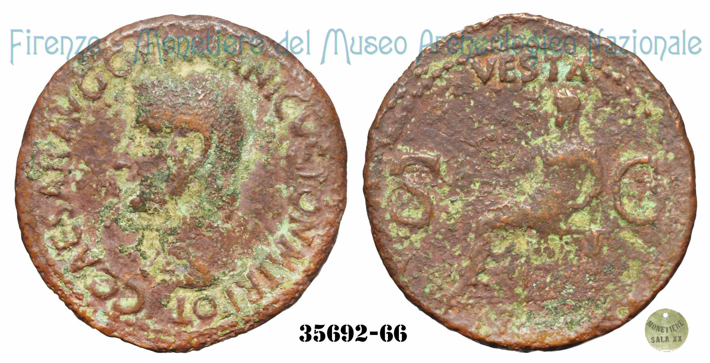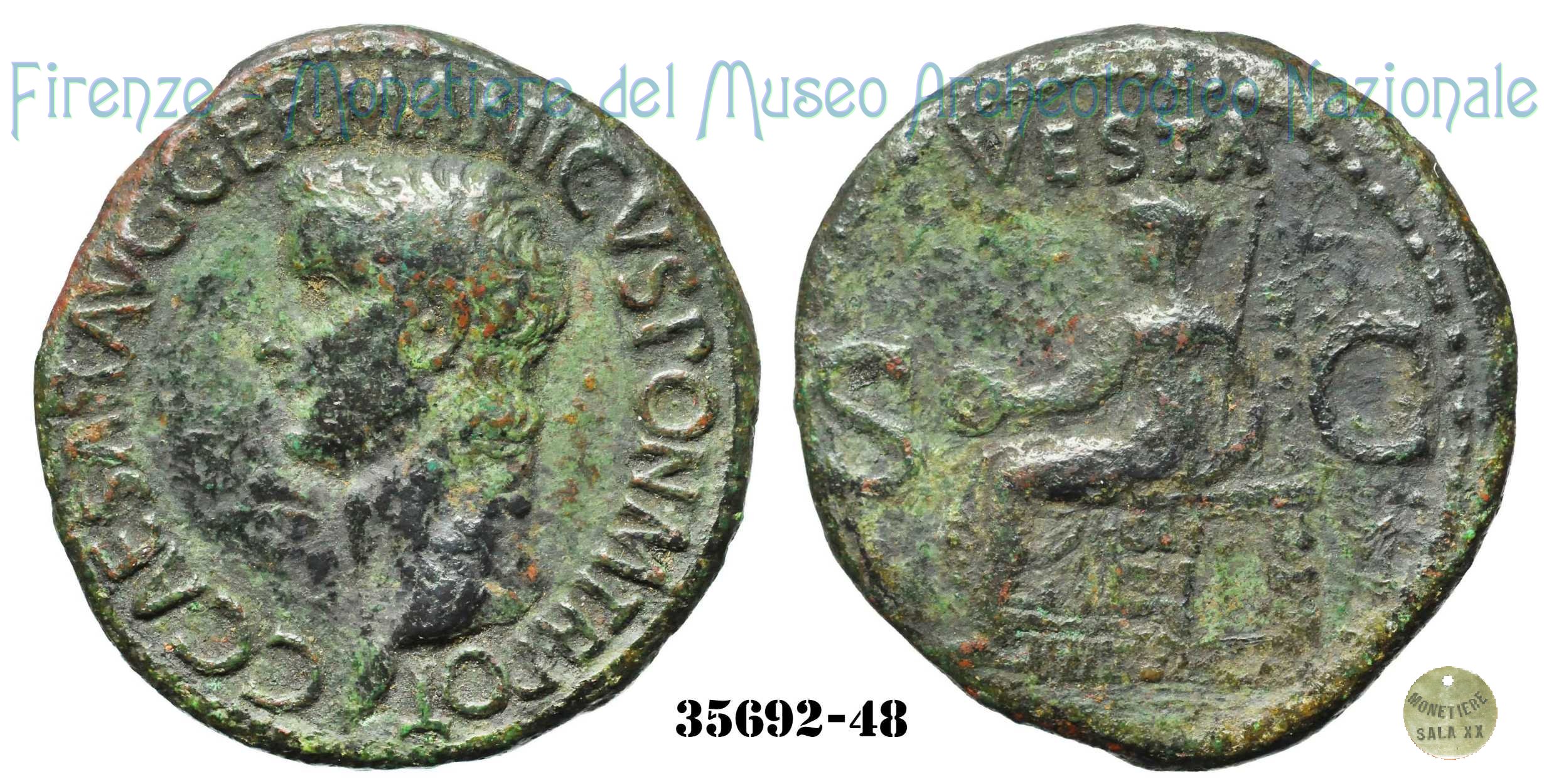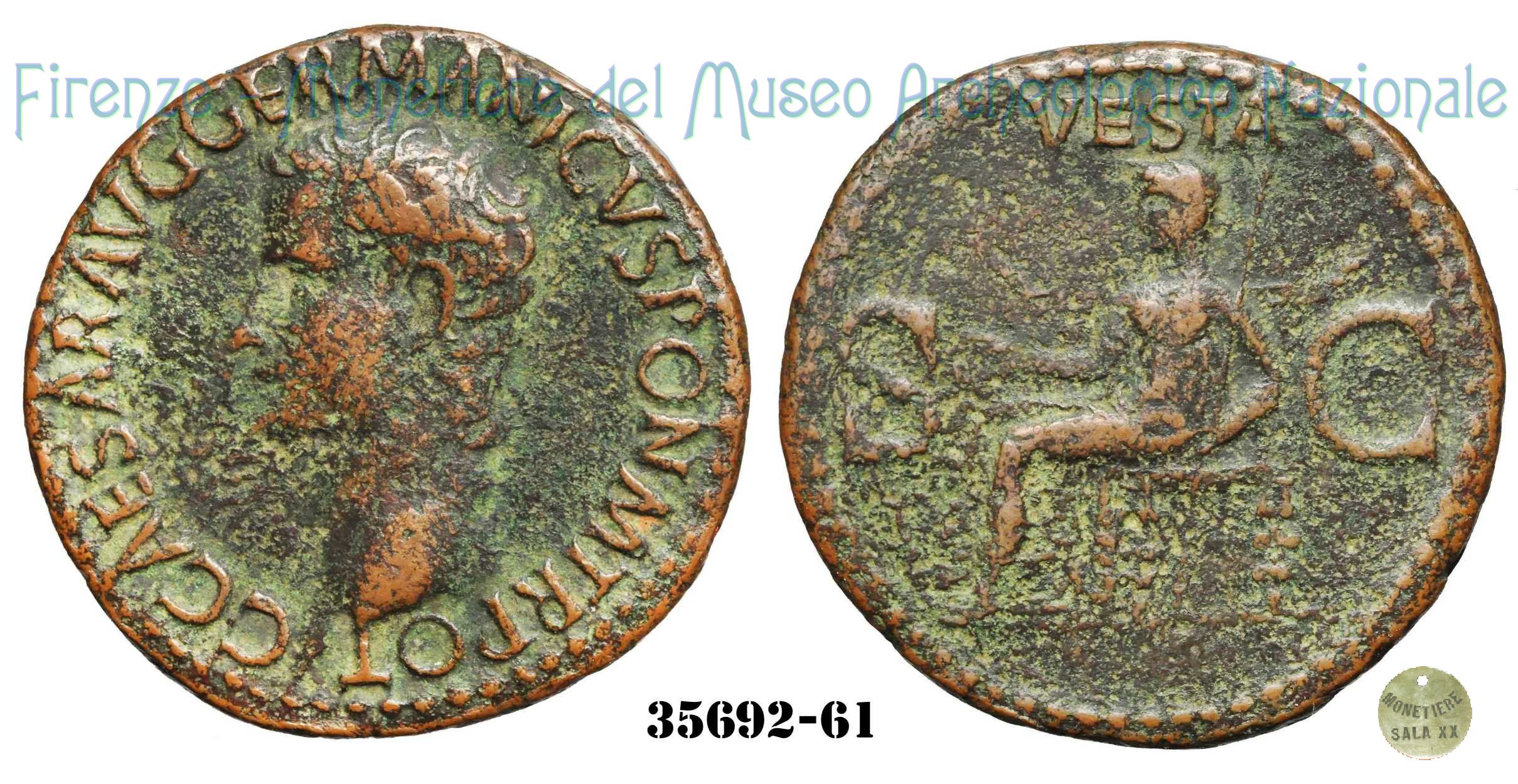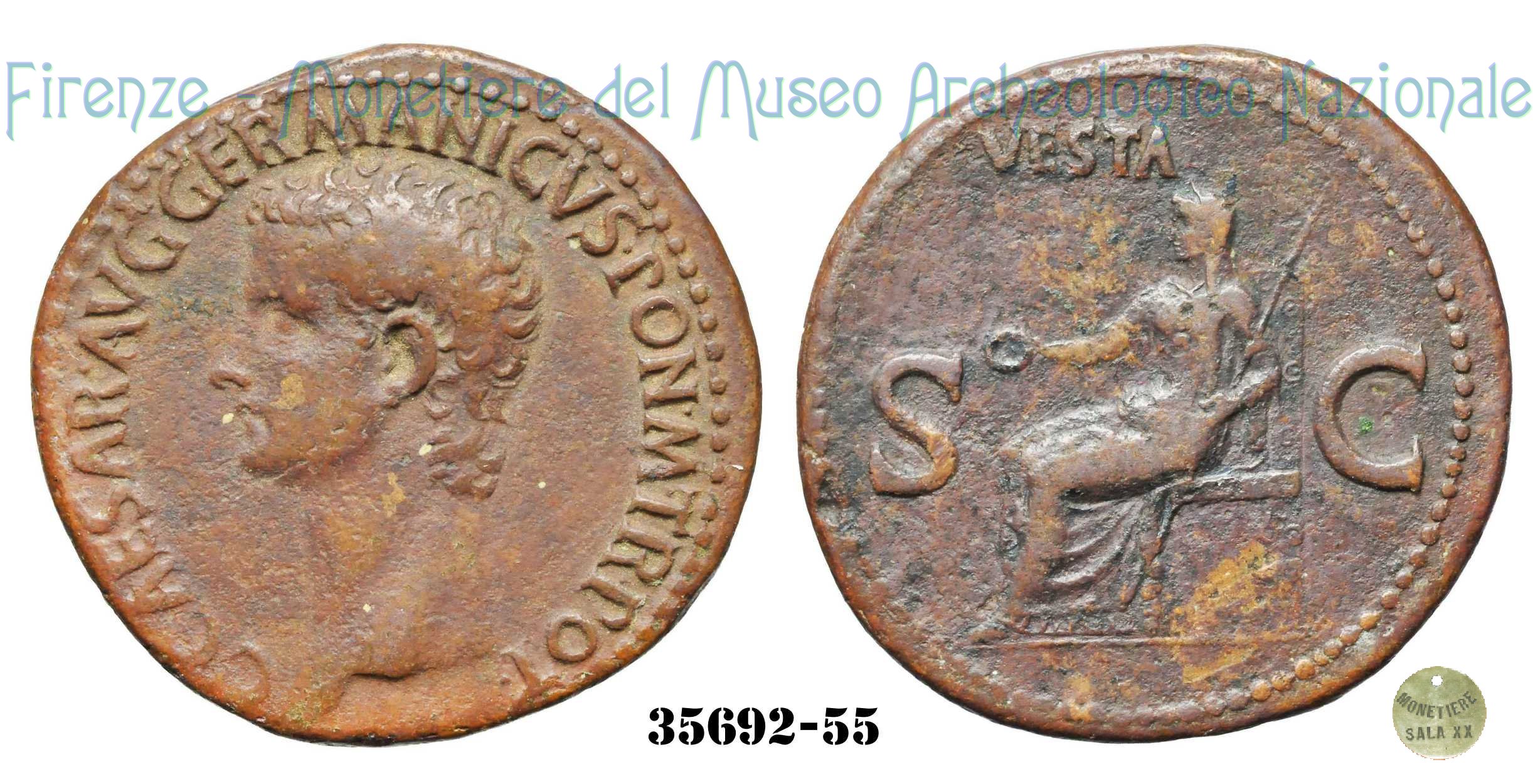 VESTA (S.C.) - Ric. 38 (37-38 d.C. - Roma) D/ C CAESAR AVG GERMANICVS PON M TR POT R/ VESTA (in alto) S - C a sinistra e destra Ric. 38 (Vol.1); BMC 46; GiuCla 465. | Monetiere Archeologico Firenze | Fri 26/07/13 - 10:09 | ||