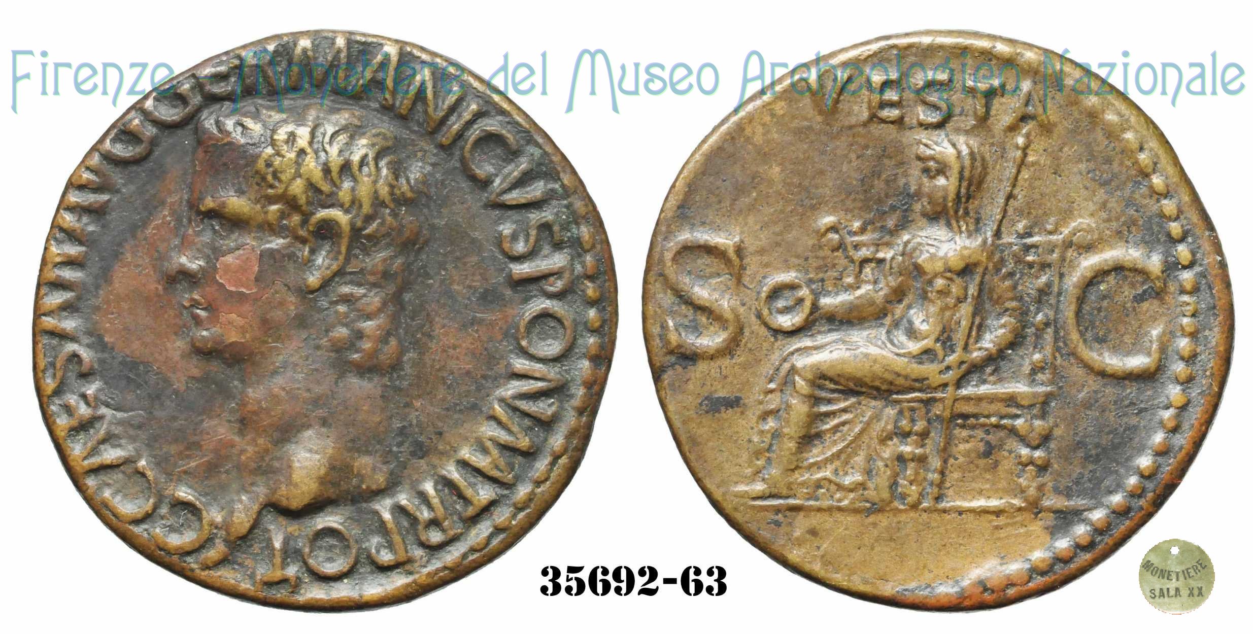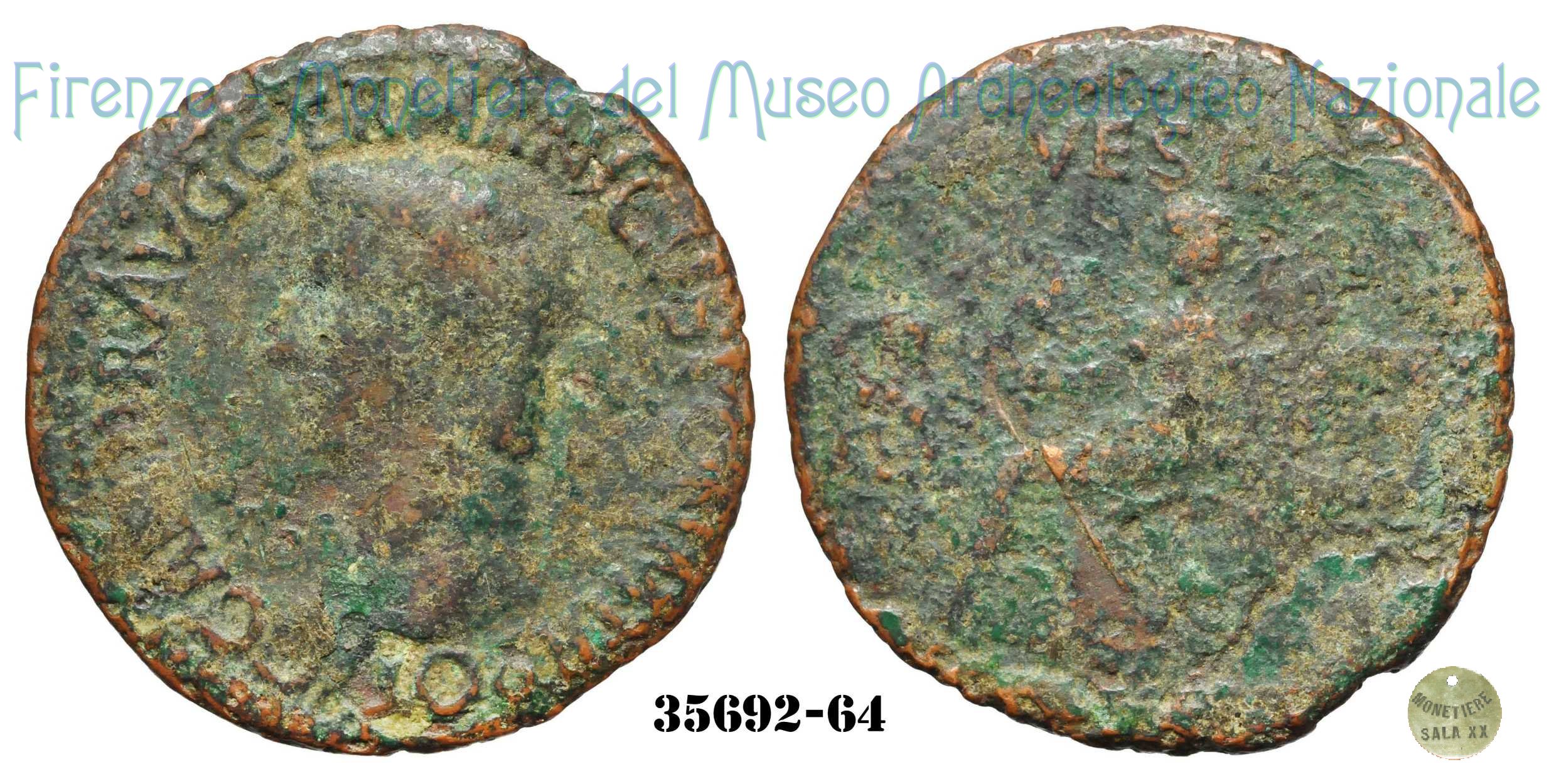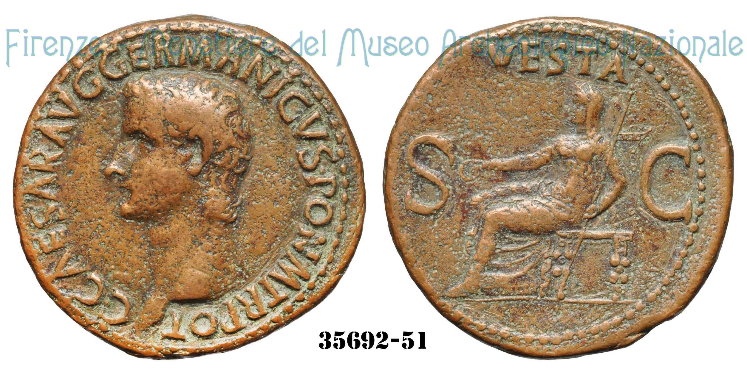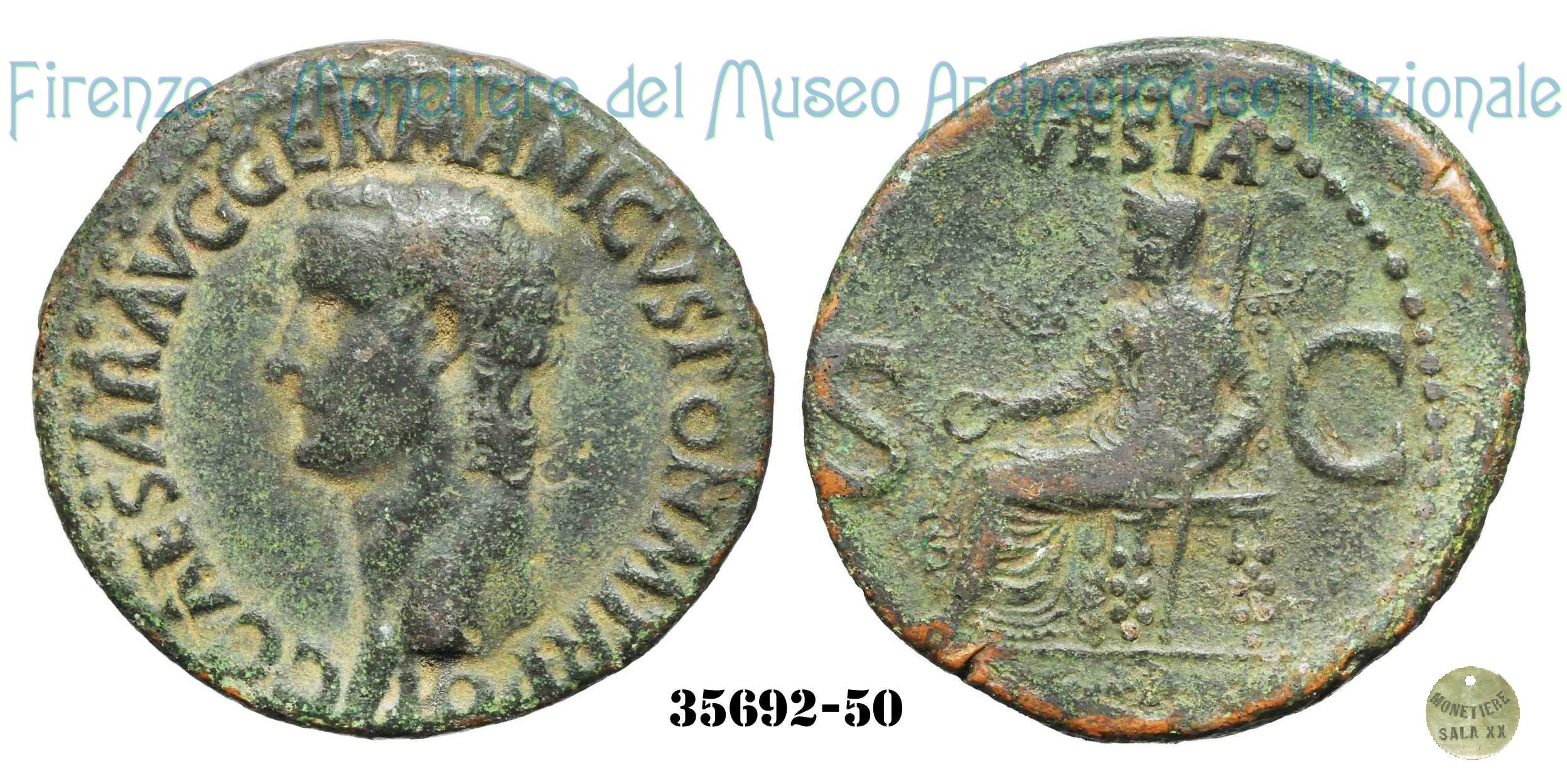 VESTA (S.C.) - Ric. 38 (37-38 d.C. - Roma) D/ C CAESAR AVG GERMANICVS PON M TR POT R/ VESTA (in alto) S - C a sinistra e destra Ric. 38 (Vol.1); BMC 46; GiuCla 465. | Monetiere Archeologico Firenze | Fri 26/07/13 - 10:09 | ||