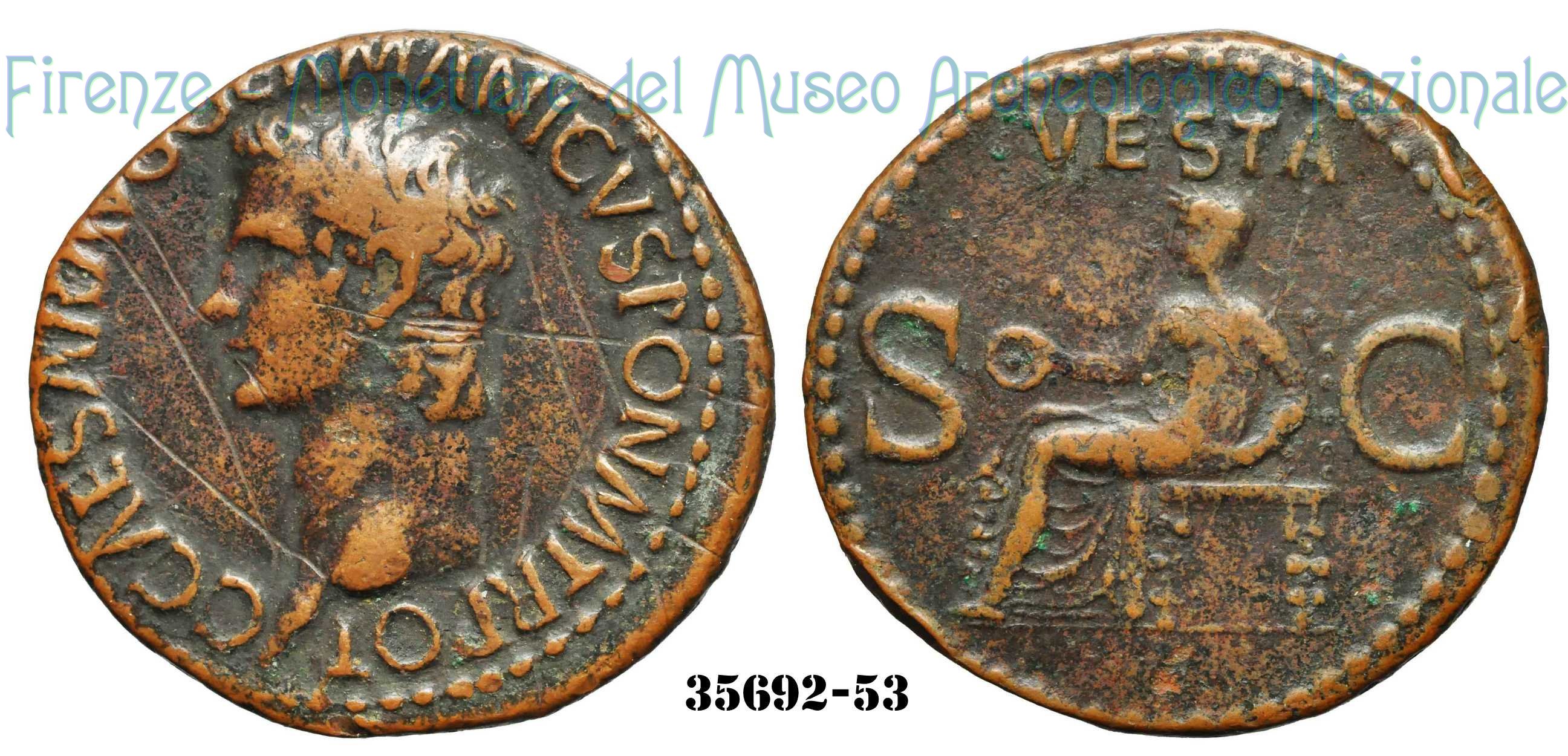 VESTA (S.C.) - Ric 47 (39-40 d.C. - Roma) D/ C CAESAR DIVI AVG PRON AVG PM TRP III PP R/ VESTA (in alto) S - C a sinistra e destra Ric, I, 47; Migliarini 419. | Monetiere Archeologico Firenze | Mon 29/07/13 - 11:53 | ||