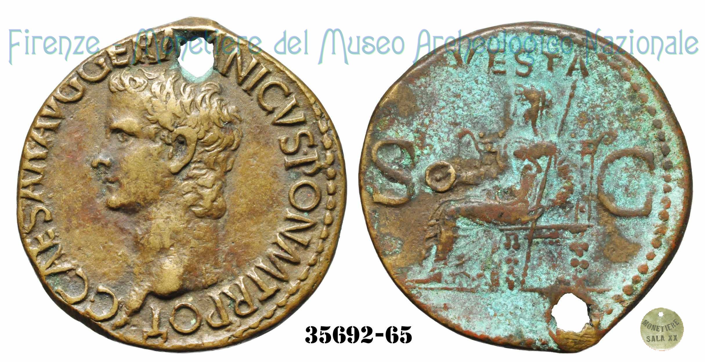 VESTA (S.C.) - Ric. 38 (37-38 d.C. - Roma) D/ C CAESAR AVG GERMANICVS PON M TR POT R/ VESTA (in alto) S - C a sinistra e destra Ric. 38 (Vol.1); GiuCla 361; BMC 46 | Monetiere Archeologico Firenze | Tue 23/07/13 - 15:04 | ||