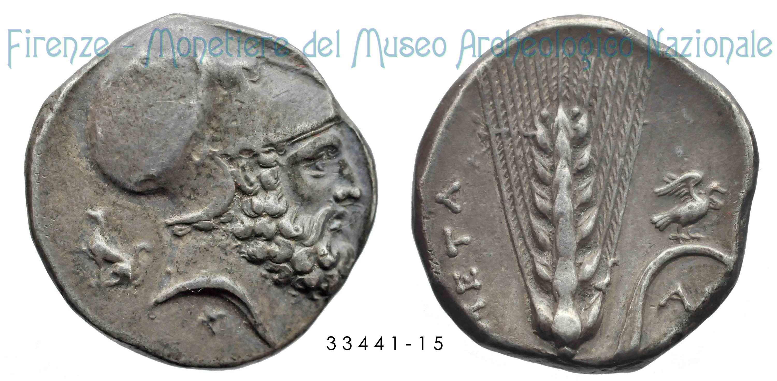Testa elmata di Leukippos_Spiga di grano (340-330 a.C. - Metapontion) D/Testa elmata di Leukippos a destra; dietro, cane seduto a sinistra con una zampa sollevata; davanti, dall’alto [ΛEYKIΠΠOΣ]; sotto Σ R/ Spiga con foglia a destra; a sinistra dal basso, META; a destra sulla foglia, uccello ad ali aperte, sotto la foglia, A[MI];