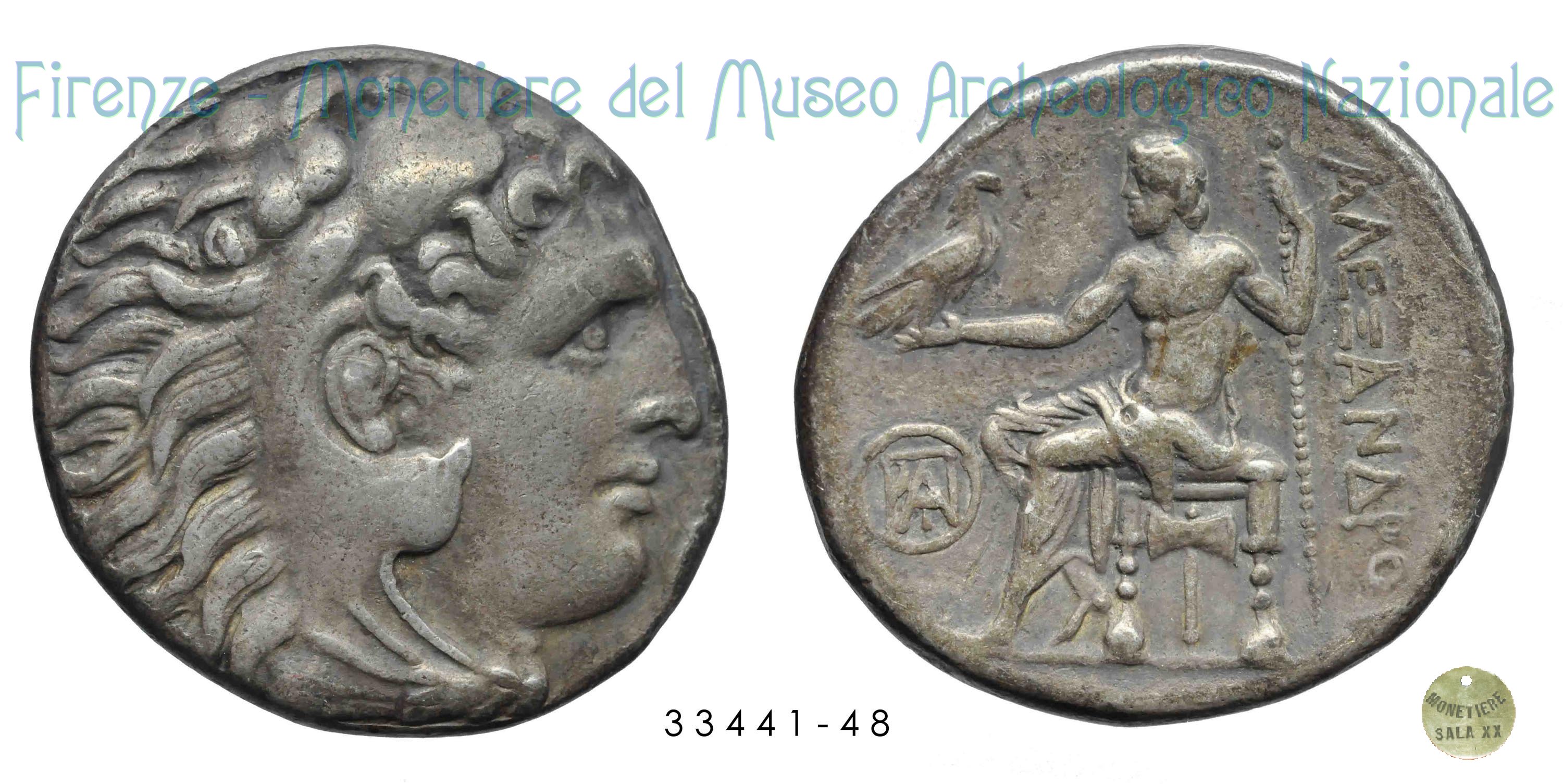 Testa di Eracle con copricapo leonino_Zeus seduto a sinistra (336-323 a.C.) D/ Testa di Eracle a destra coperta con leontè; R/ Zeus seduto a sinistra con aquila nella destra tesa e scettro nella sinistra; davanti, monogramma entro cerchio lineare; sotto il trono, ascia bipenne; dietro, dall’alto, AΛEΞANΔPOY; M. J. Price, The Coinage in the name of Alexander the Great and Philip Arrhidaeus (1991), n.2147. | Monetiere Archeologico Firenze | Sun 26/02/12 - 14:39 | ||