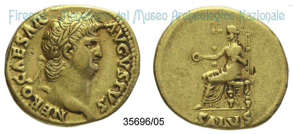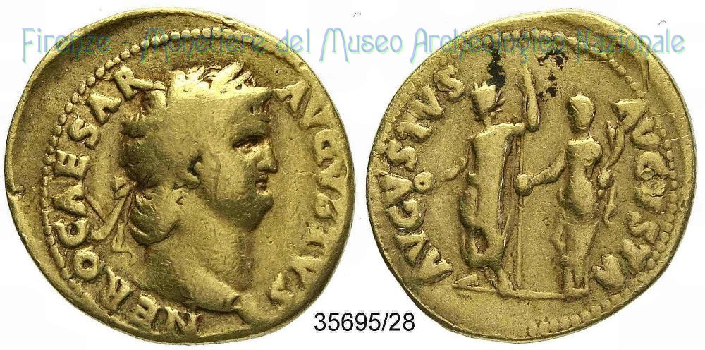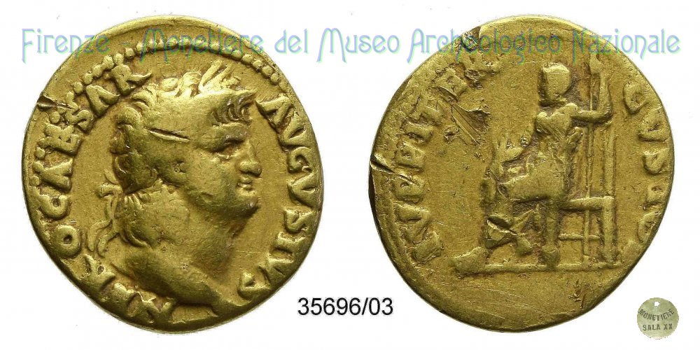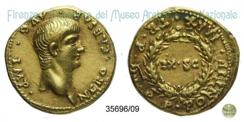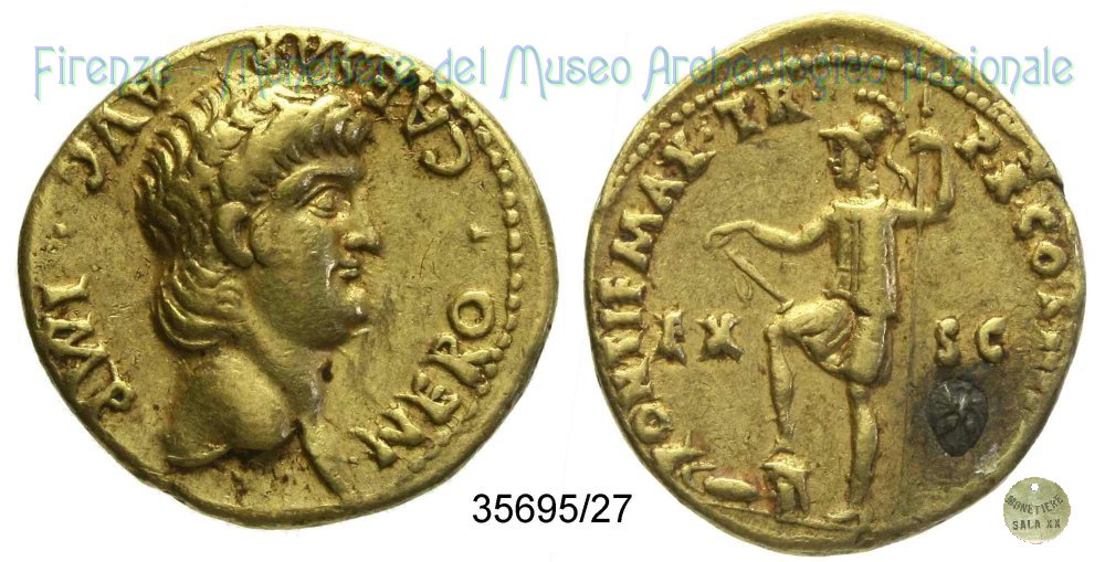 PONTIF MAX TR P VII COS IIII PP / EX SC - RIC 21 (60-61 d.C. - Roma) D/ NERO CAESAR AVG IMP R/ PONTIF MAX TR P VII COS IIII PP / EX SC (al centro) NB: al r. il numero del consolato visibile è il III anzichè il IIII, tale mancanza è dovuta con molta probabilità ad un difetto della coniazione.