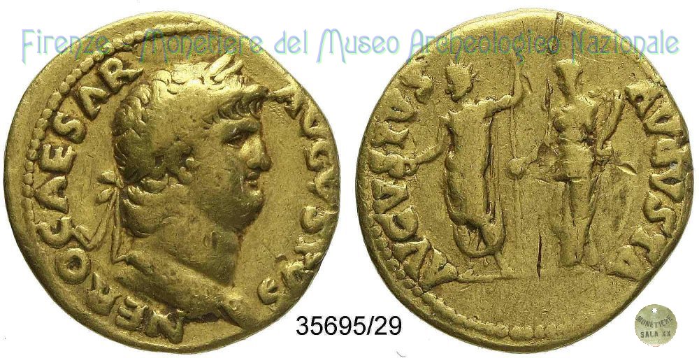 PONTIF MAX TR P VIII COS IIII P P / EX-SC | Ric 33 (61-62 d.C. - Roma) D/ NERO CAESAR AVG IMP R/ PONTIF MAX TR P VIII COS IIII P P / EX-SC Nota: al rovescio Roma poggia il piede, invece che sul consueto elmo, su un gradino indefinito. Non compaiono nemmeno la daga e l'arco solitamente posti alla destra dell'elmo. Ric. 33 (Vol. 1)(variante?)