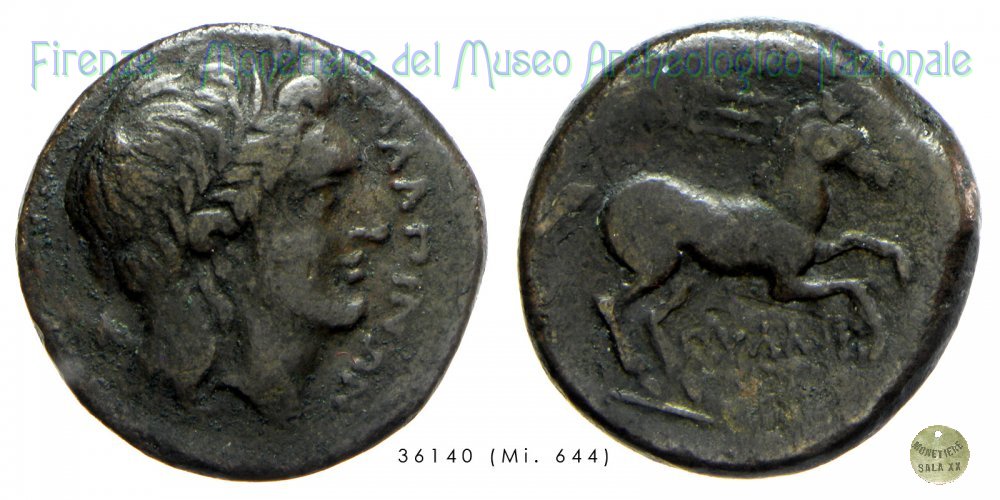 AE_Serie Testa di Apollo - Cavallo libero (225-210 a.C. - Salapia) D/ ΣΑΛAΠINΩN R/ ΠYΛΛOY HN Italy 692a;