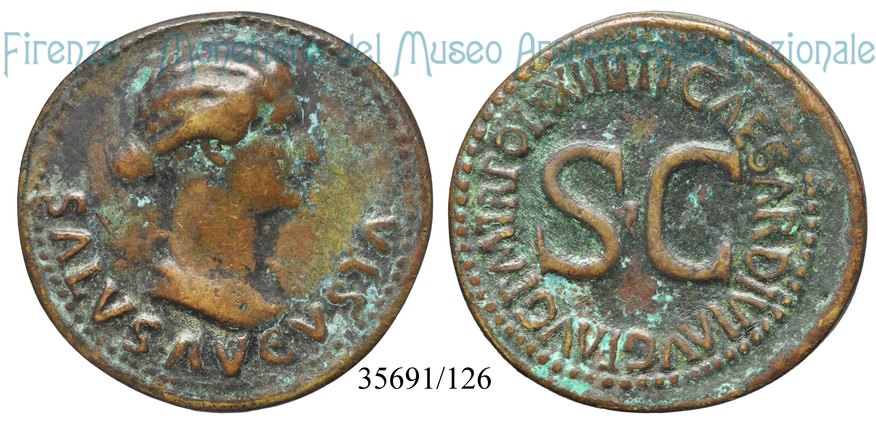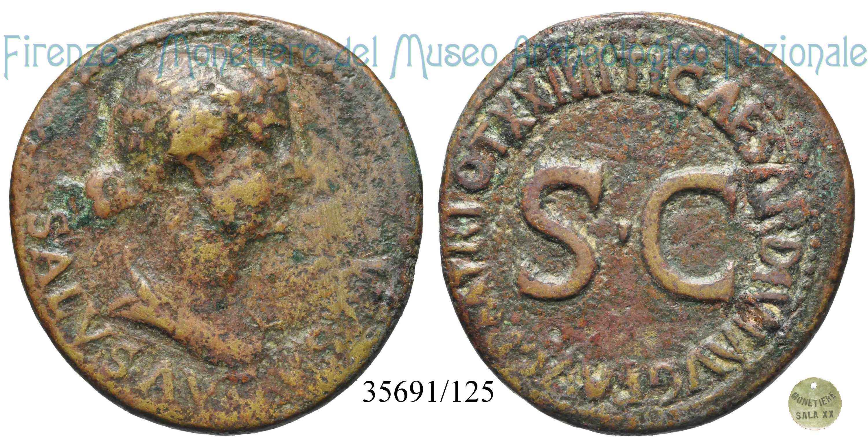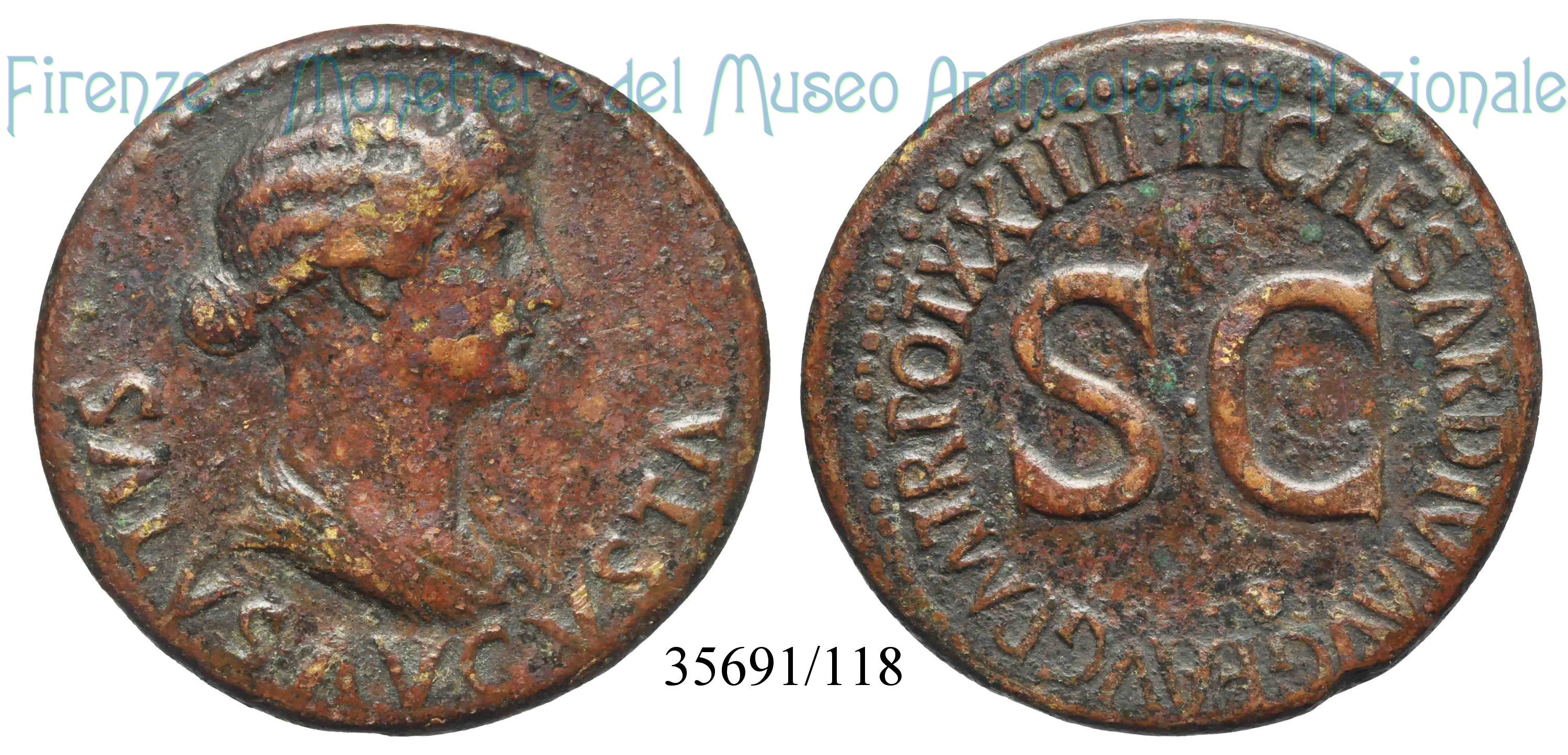 TI CAESAR DIVI AVG F AVG TR POT XXIIII S C (22-23 d.C. - Roma) D/ SALVS AVGVSTA R/ TI CAESAR DIVI AVG F AVG TR POT XXIIII S C RIC I, 47 (B) | Monetiere Archeologico Firenze | Sat 8/02/14 - 22:25 | ||