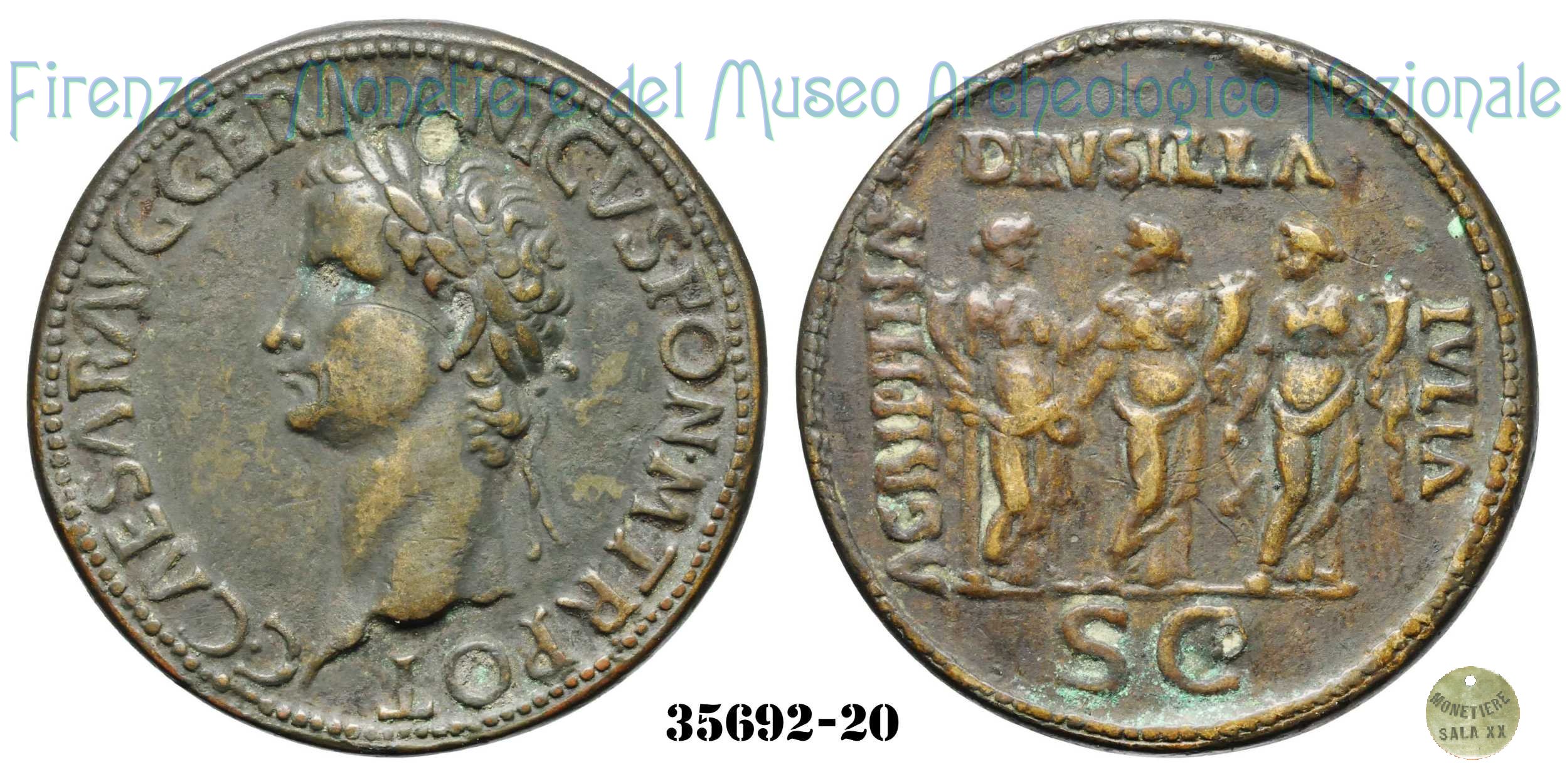 AGRIPPINA / DRVSILLA / IVLIA (37-38 d.C. - Roma) D/ C CAESAR AVG GERMANICVS PON M TR POT R/ AGRIPPINA / DRVSILLA / IVLIA Probabile moneta di fantasia creata per fusione e imitante il sesterzio dello stesso tipo classificato con il RIC 33 (Vol 1) np 005 - 24 ter. (B) | Monetiere Archeologico Firenze | Sun 30/06/13 - 09:28 |