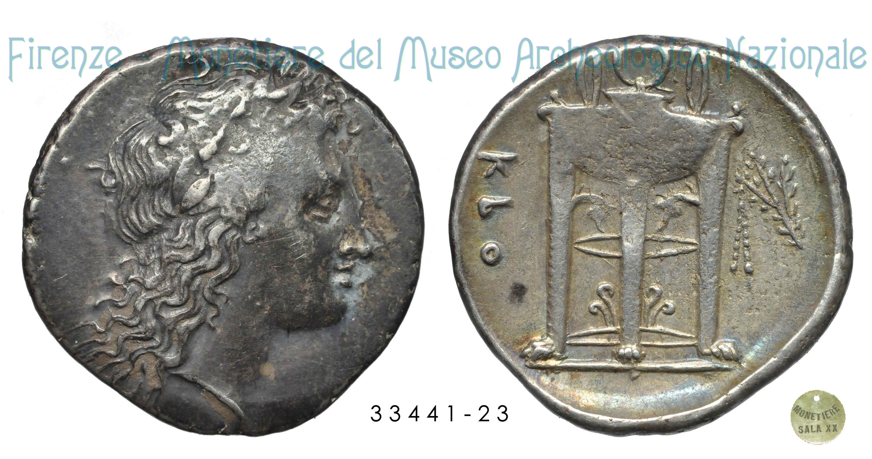 Apollo laureato_Tripode (400-376 a.C. - Croton) D/ Testa laureata di Apollo a destra; R/ Tripode; a sinistra dall’alto retrogrado, KPO; a destra, ramo d’alloro con lemnisco; HN Italy 2177;