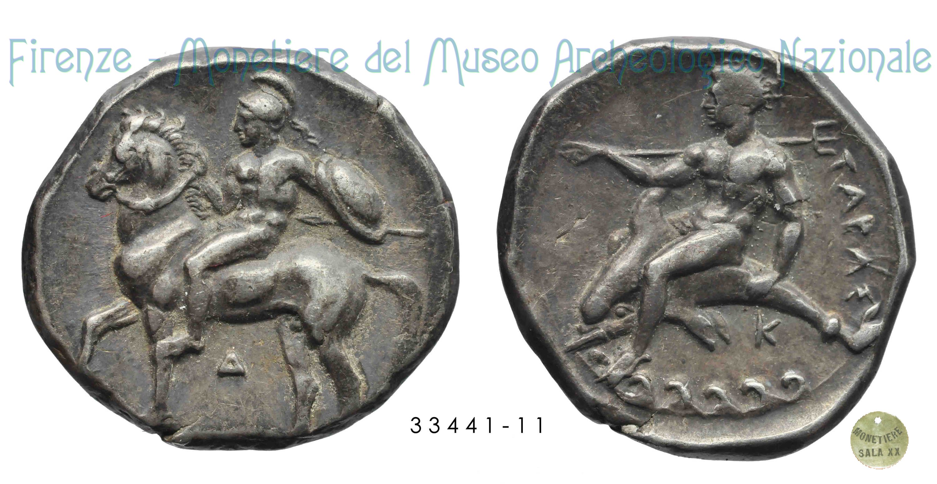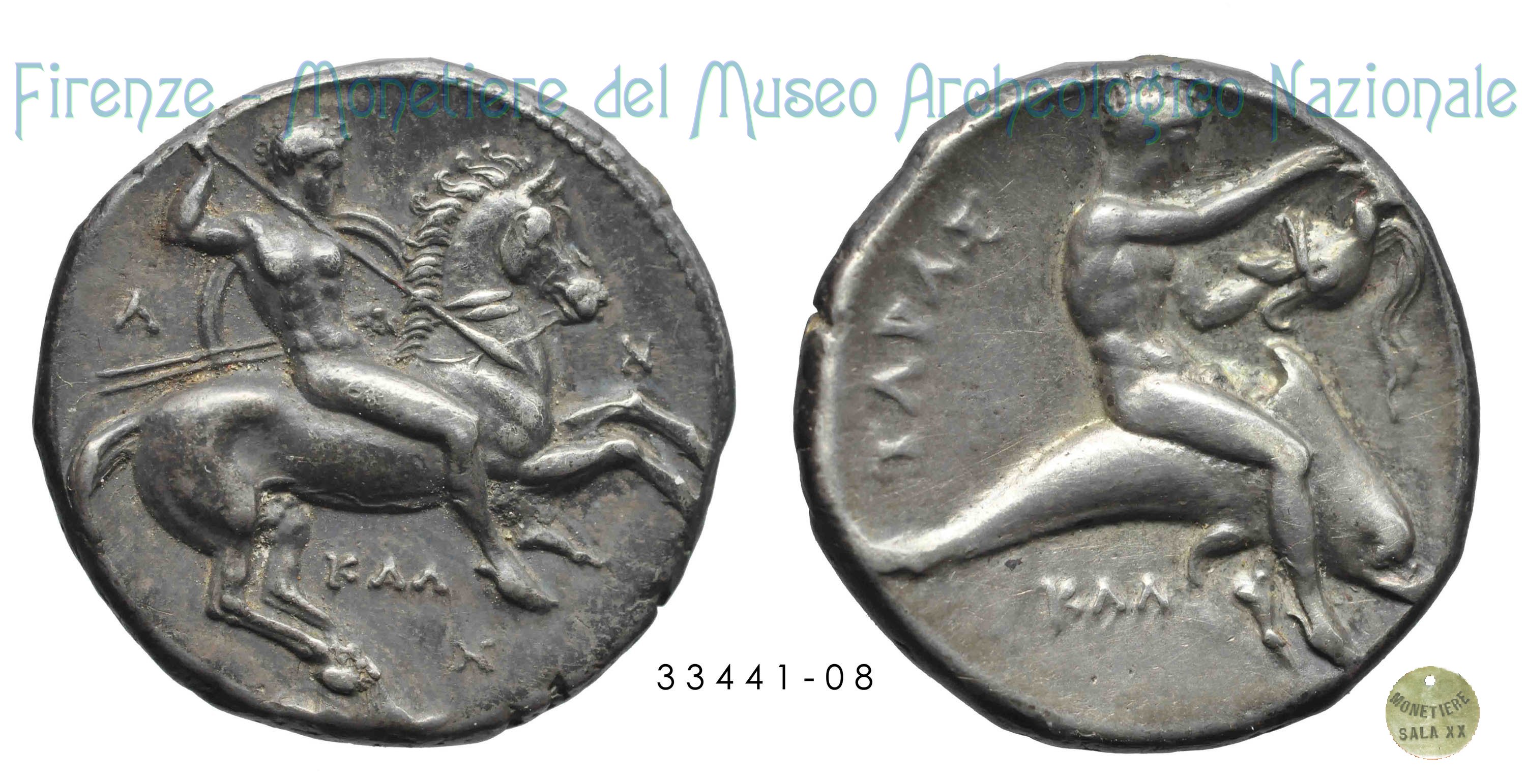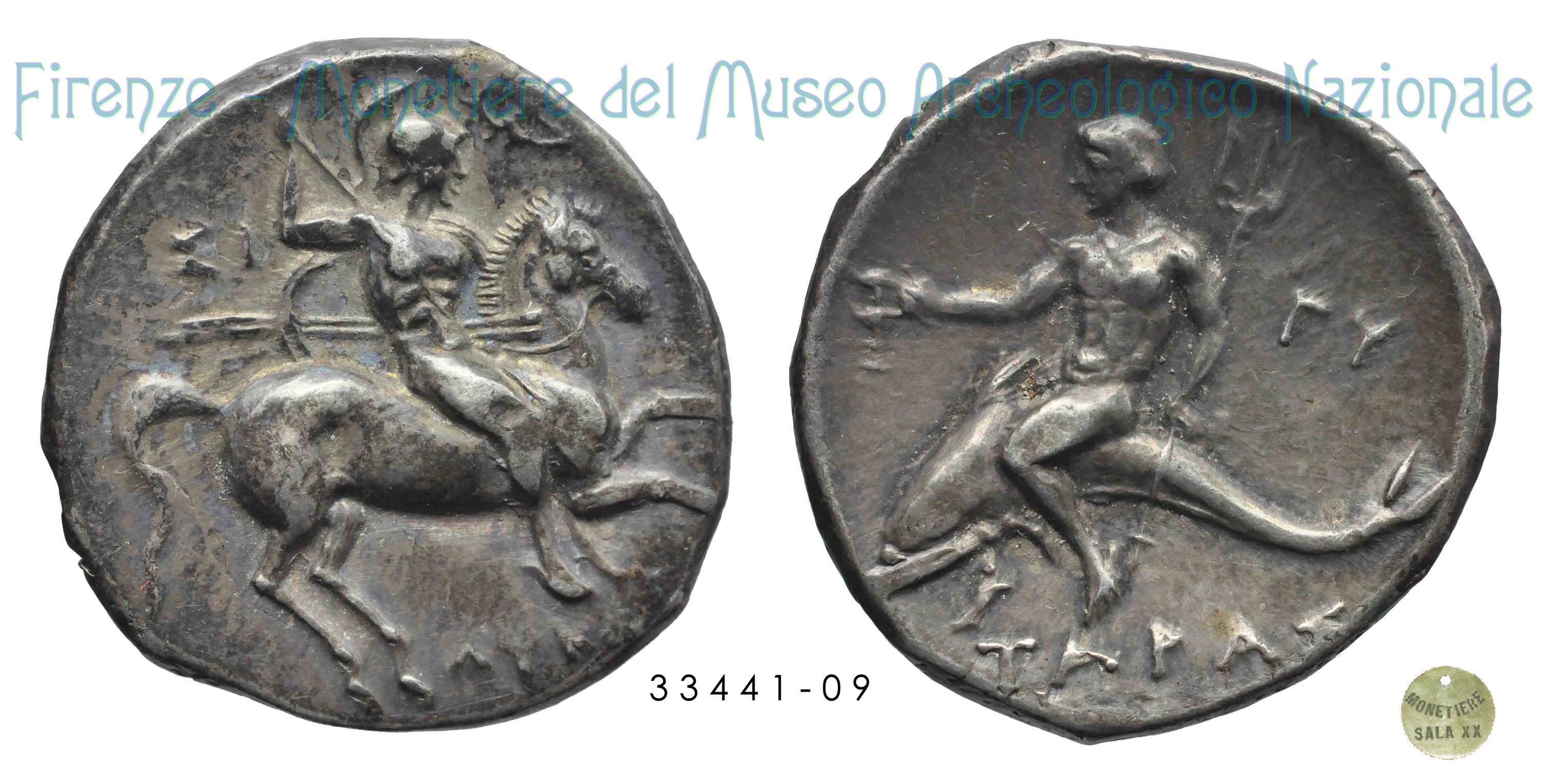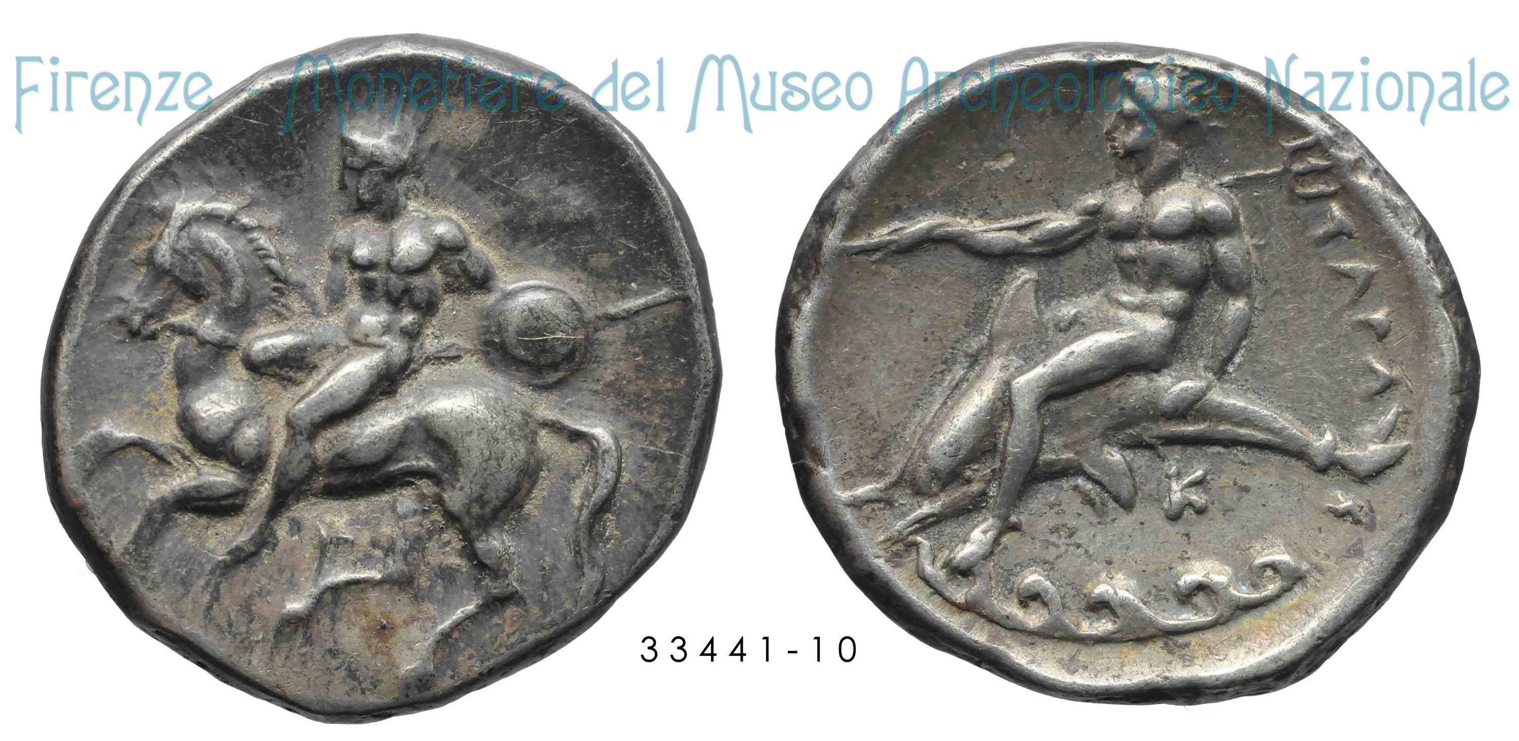 CavaliereConScudoLancia_GiovaneSuDelfino(FB_G47) (355-340 a.C. - Tarentum) D/ Cavaliere nudo con scudo e lancia in atto di saltare dal cavallo al galoppo verso sinistra; sotto, ├. R/ Giovane nudo che cavalca un delfino verso sinistra, tiene tridente all'indietro con la mano destra; dietro dall’alto, TAPA - Σ; sotto, K e onde. Vlasto ;